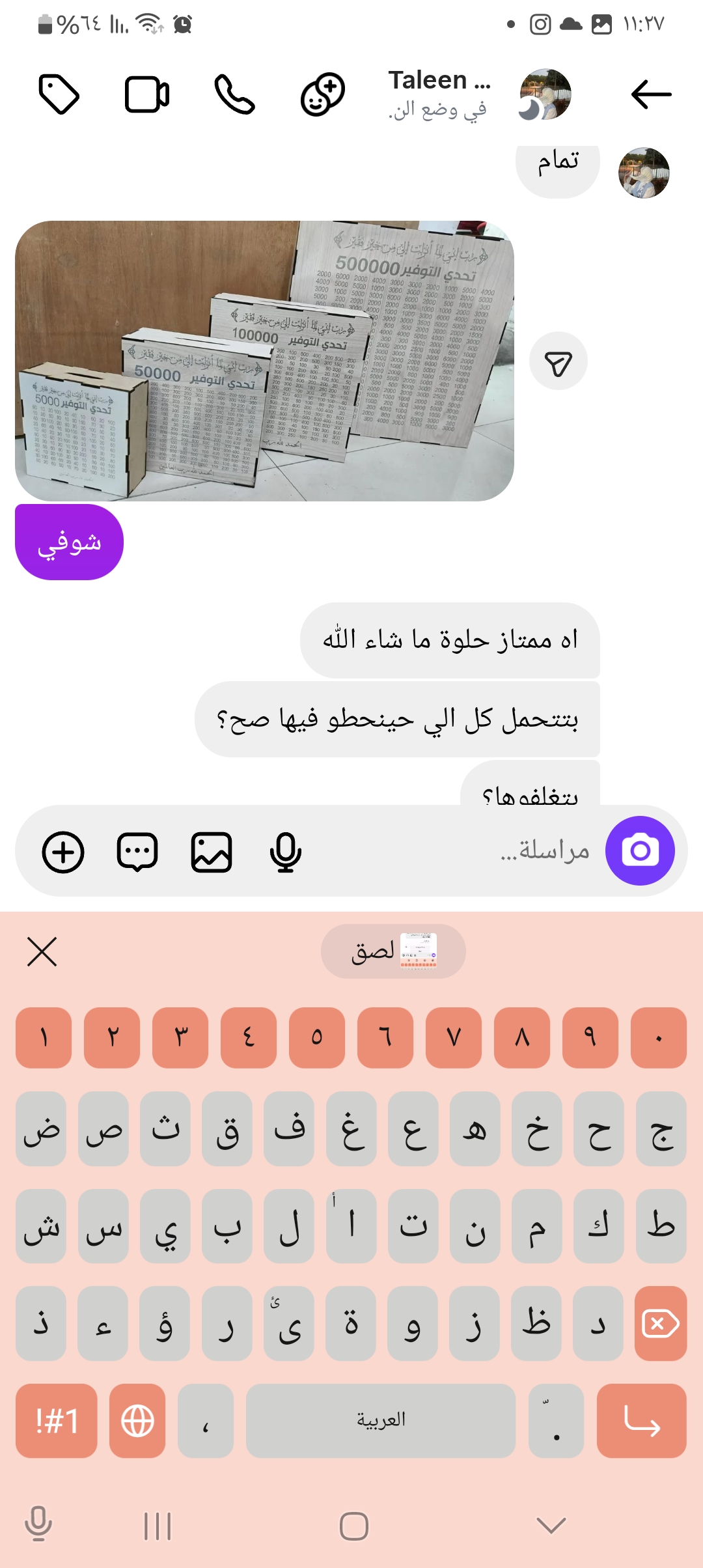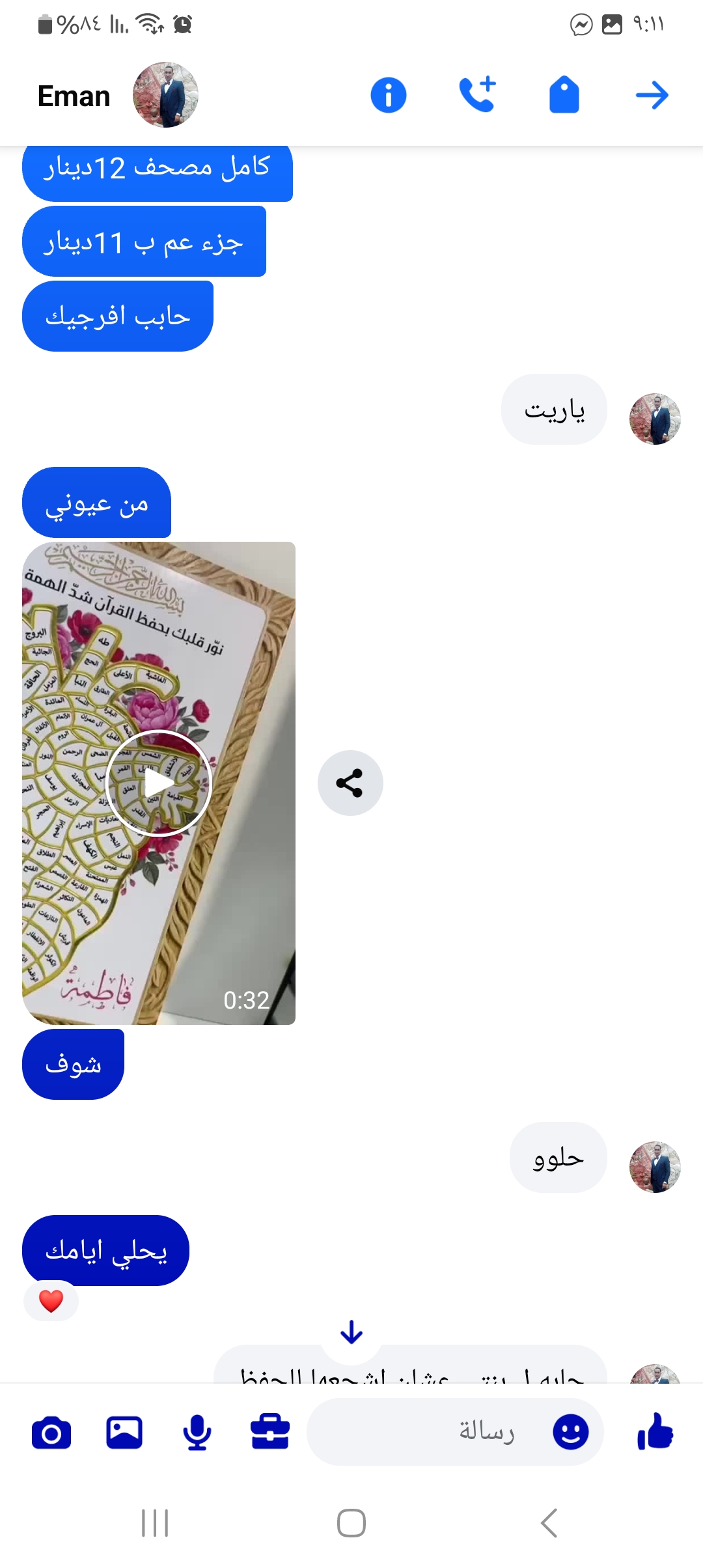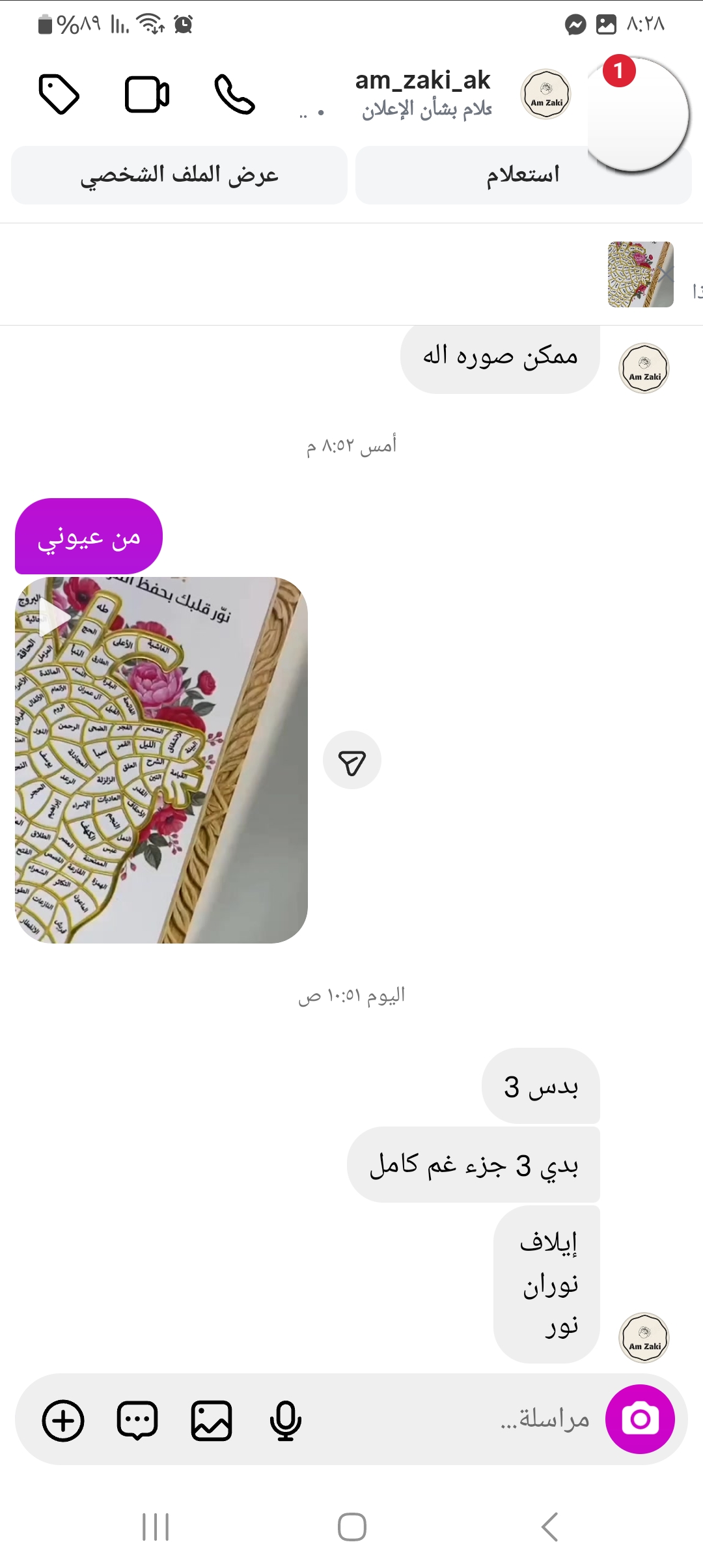 12 احمد شرباتي مندوبه إسراء مستعجله استلامها بكره يوم احد بعد ساعه وحده 0522829152 2026-01-11 02:27:29 برواز بازل قلب القران اسراء