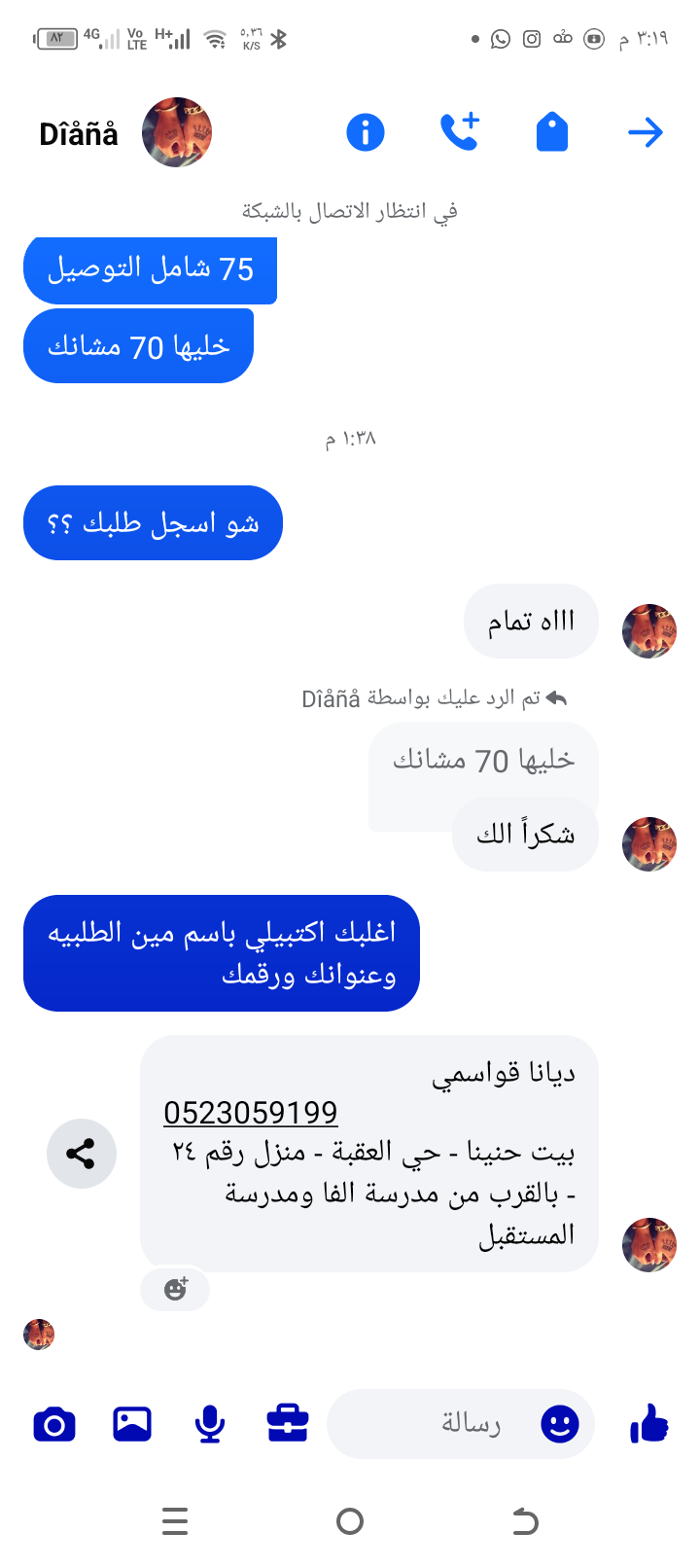 صابرين مناصره مندوبه إسراء مستعجله جدا استلام من محل بعد ظهر |