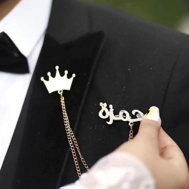 بروش بدله لسم طارق وعلى التاج اسم عبير لون فضي لغه عربي