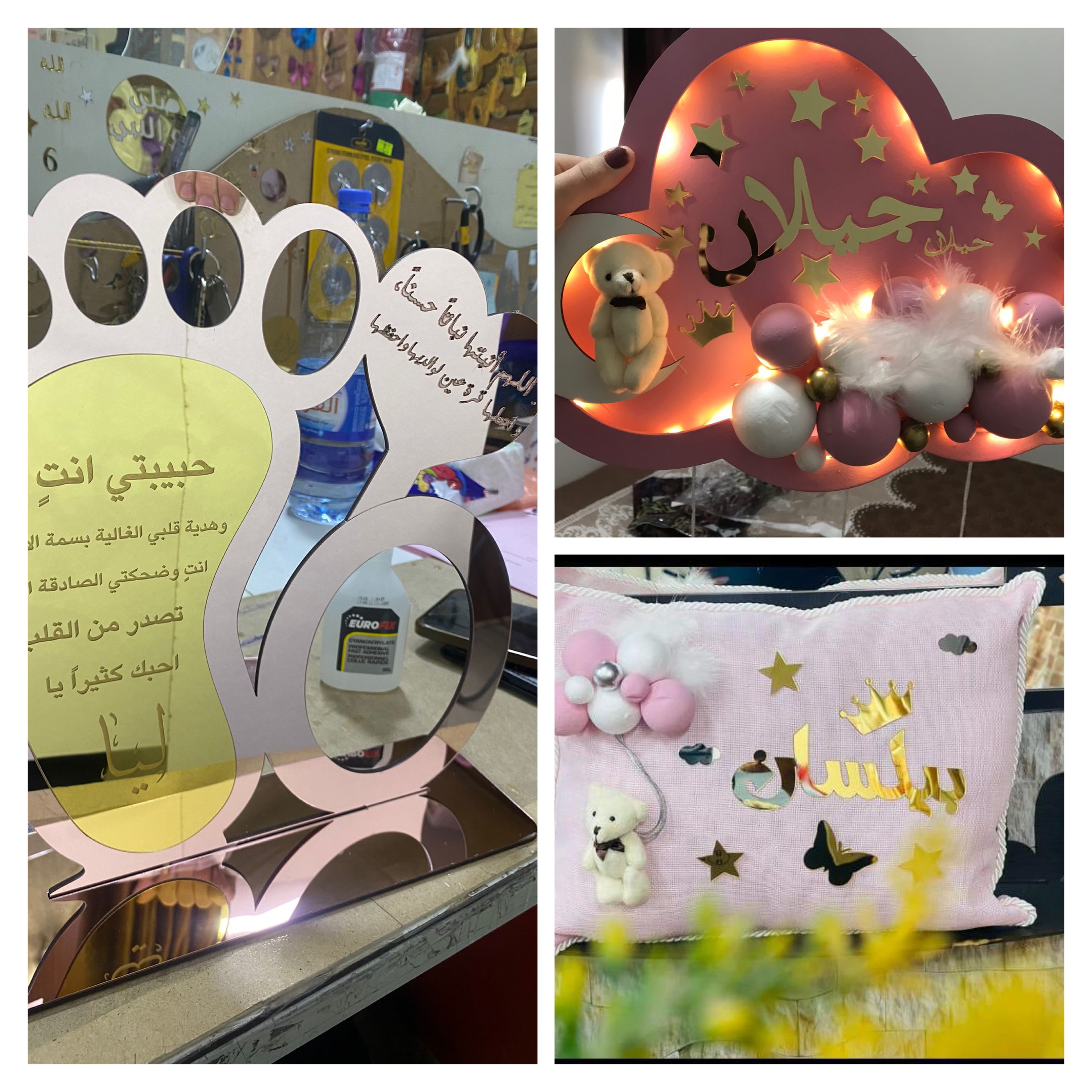 2-تعليقه غيمه لون زهري الاسم اميمة لون الاسم دهبي مع الاشكال