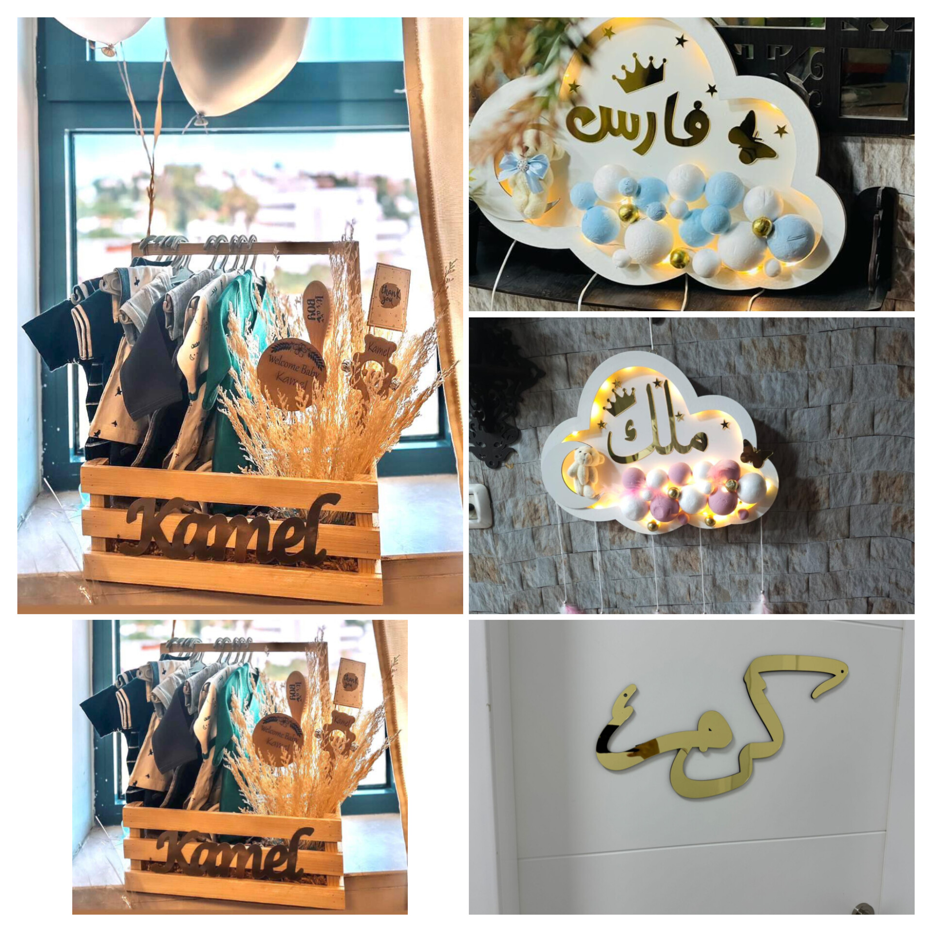 2- تعليقه لون ابيض مع كرات زهري الاسم منيره لون الاسم ذهبي مع الاشكال ....