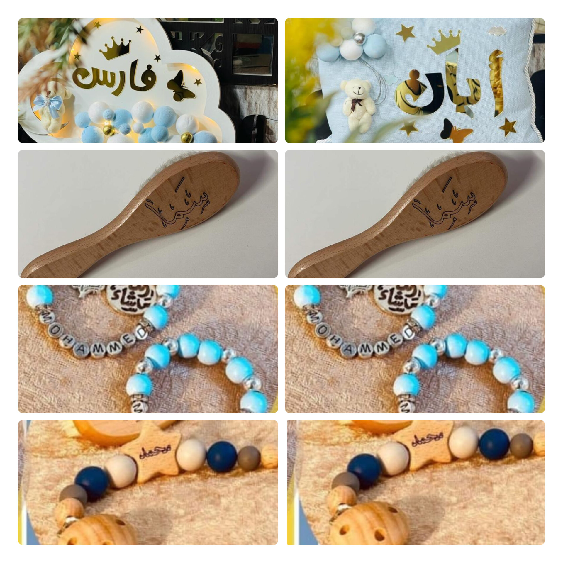 1- تعليقه غيمه لون ابيض كامل مع كرات ازرق عليها اسمين ( وفا & وتين ) لون الاسماء دهبي.....