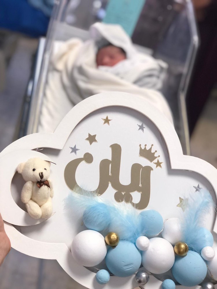 تعليقه لون ابيض بالكامل مع كرات ازرق الاسماء محمد & احمد لون الاسم دهبي مع الاشكال
