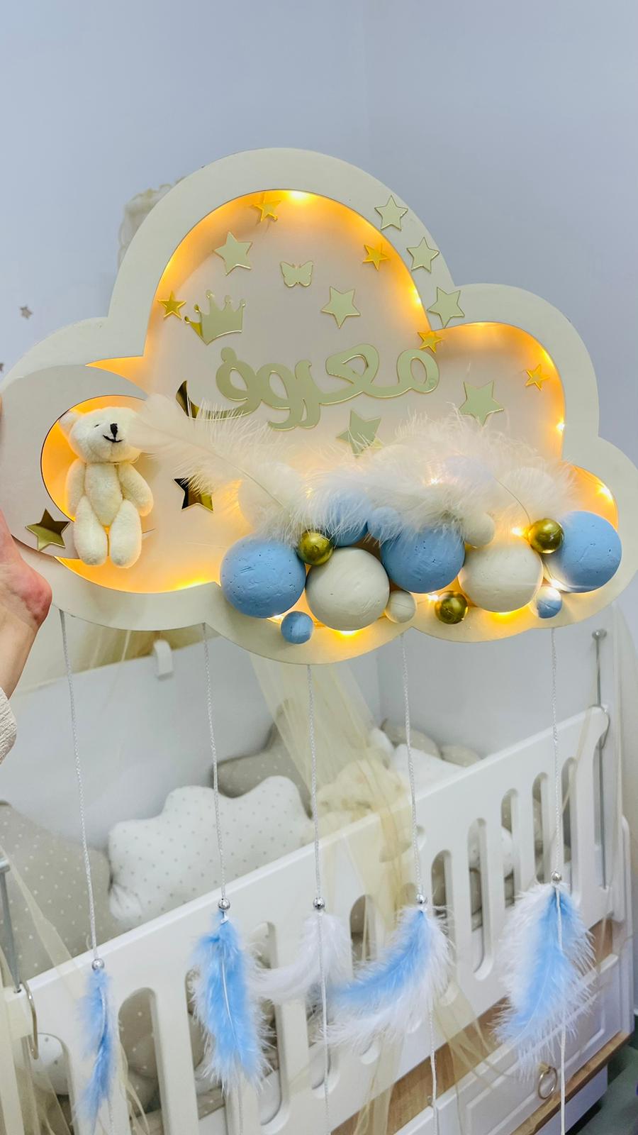 تعليقة لون بيج مع كرات بيج وازرق الاسم إلياس لون الاسم ذهبي مع الاشكال