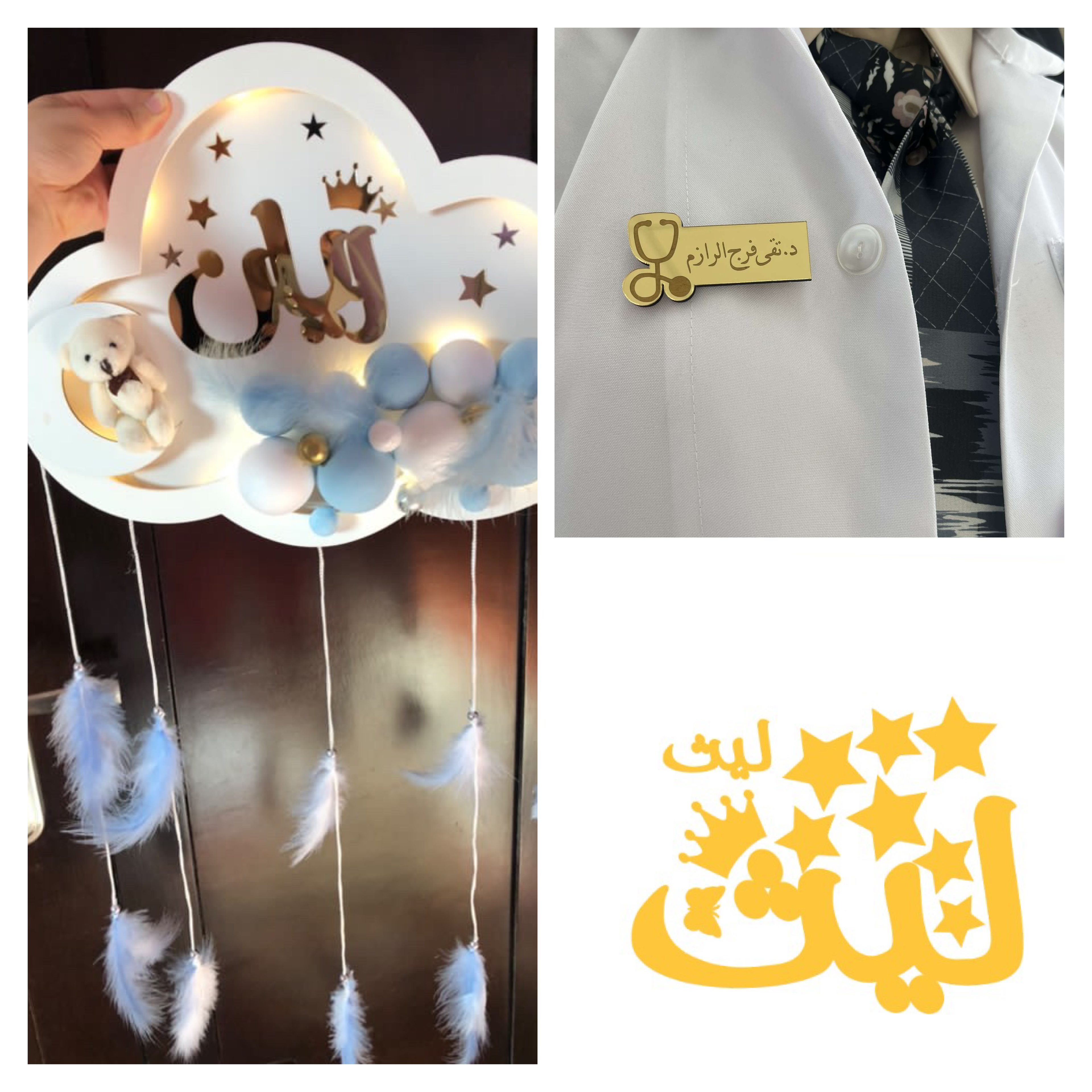 1-تعليقة غيمه لون ابيض مع كرات ازرق الاسم حمزة لون الاسم ذهبي مع الاشكال
