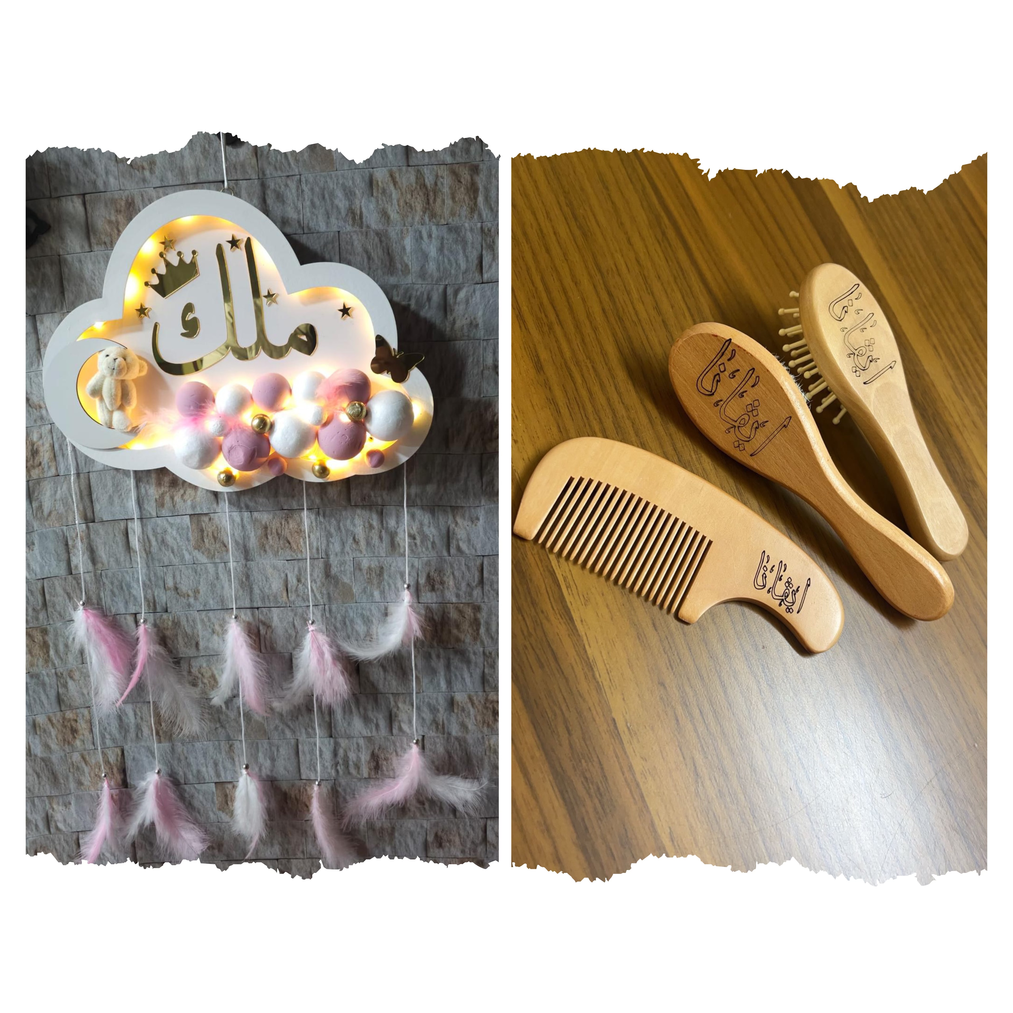 1-تعليقه غيمه لون ابيض مع كرات زهري وابيض الاسم قمر لون الاسم دهبي مع الاشكال ….