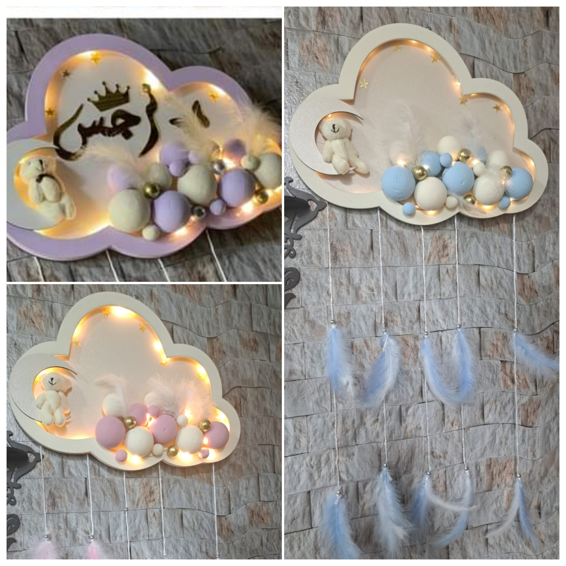 1*تعليقه غيمه لون بيج مع كرات ازرق الاسم عزمي لون الاسم دهبي مع الاشكال ...