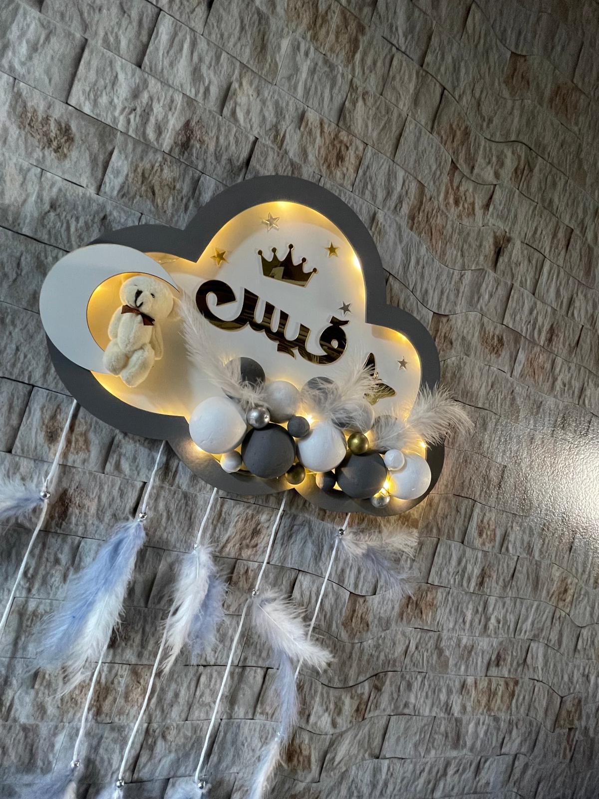 تعليقة غيمه بدون اضاءه لون ابيض والحواف سكني الاسم ياسين لون الاسم دهبي مع الاشكال