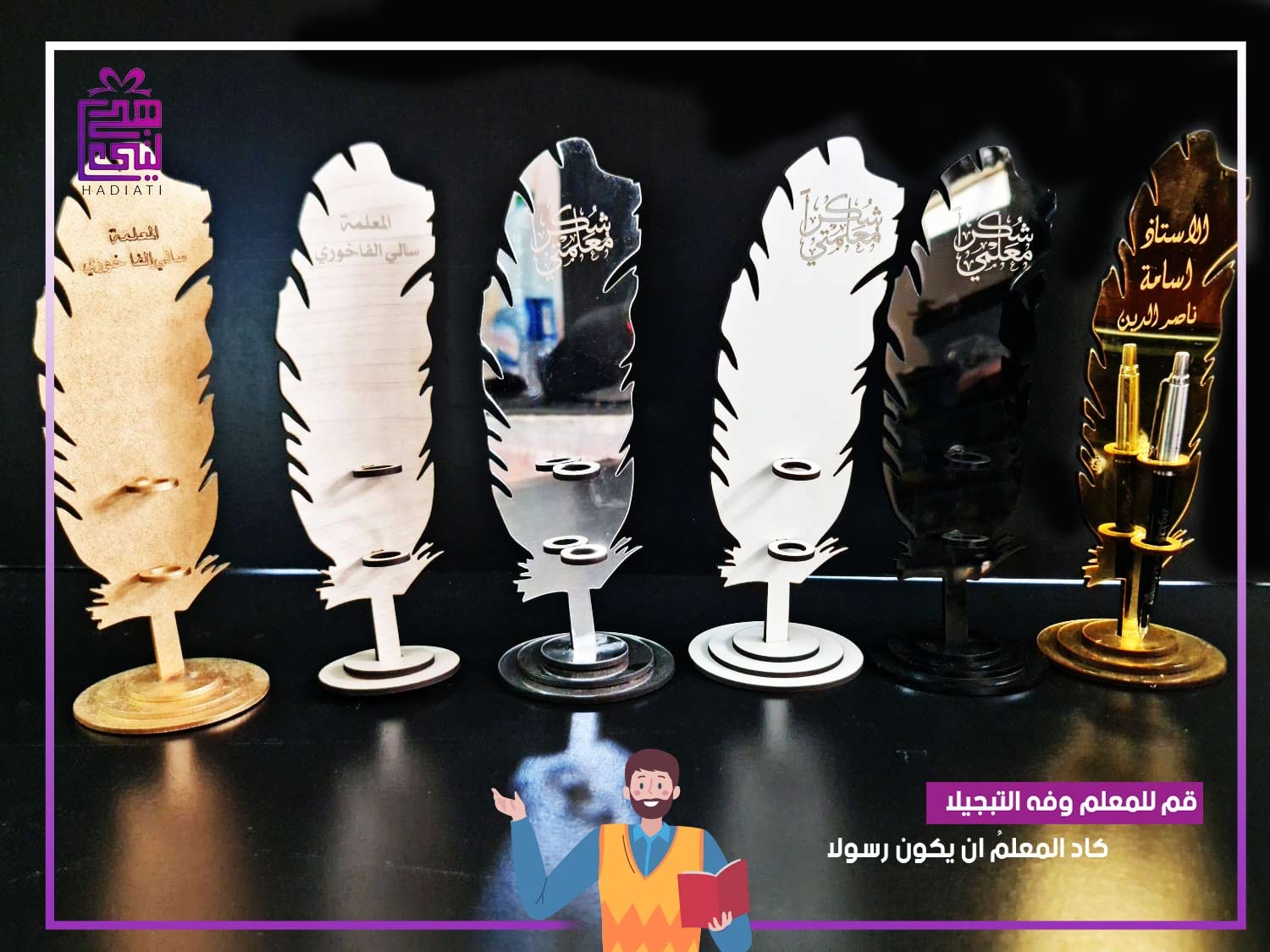 هدية معلم ستاند الريشه عدد 10 .... وحده لون ذهبي نكتب عليها المديرة سعاد سليم ..... و 9 لون فضي نكتب عليهم شكراً معلمتي والاسماء ( حنان