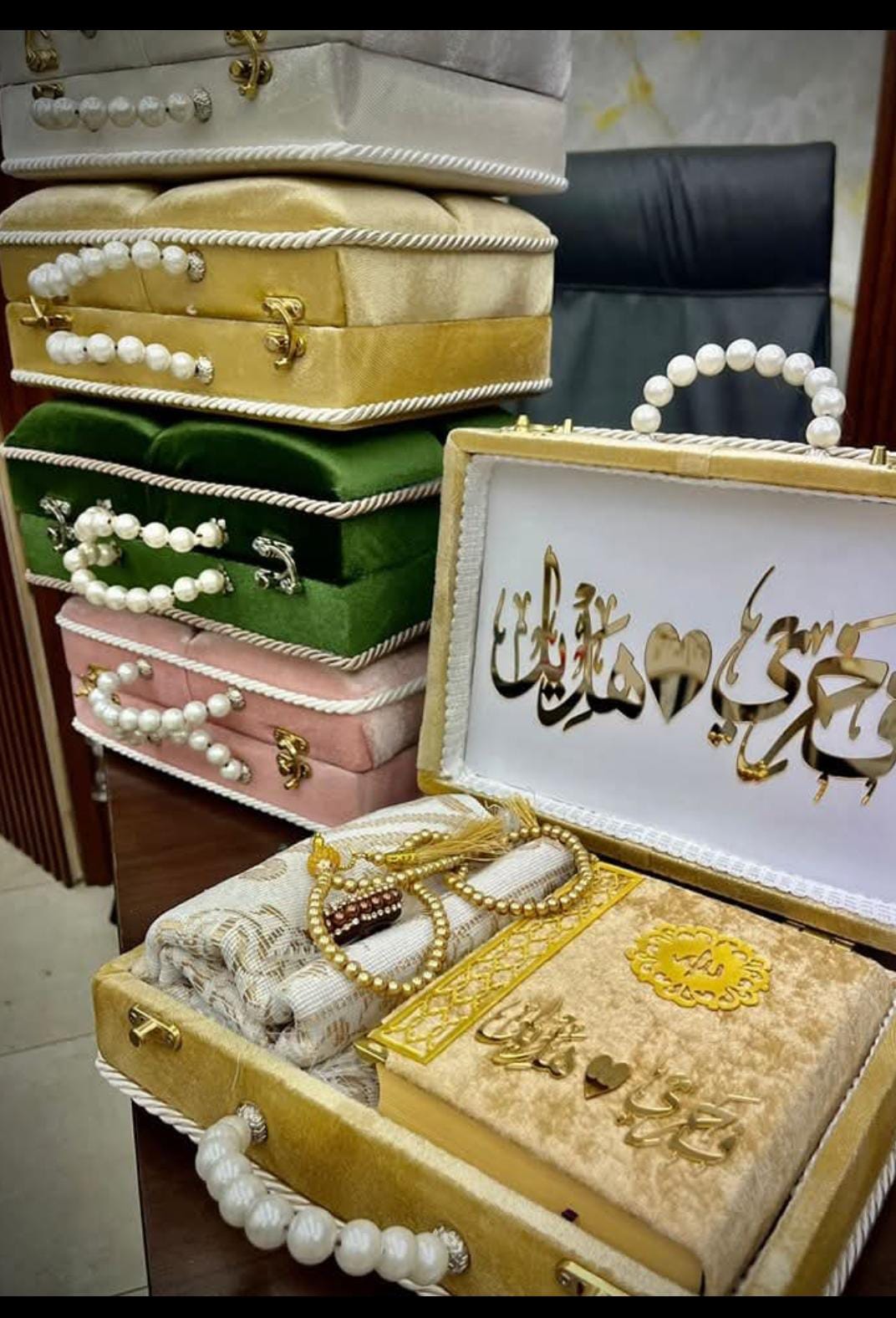 بكج كامل للمصحف لون ابيض مكون من مصحف ومصليه وسبحه عاديه والالكترنيه