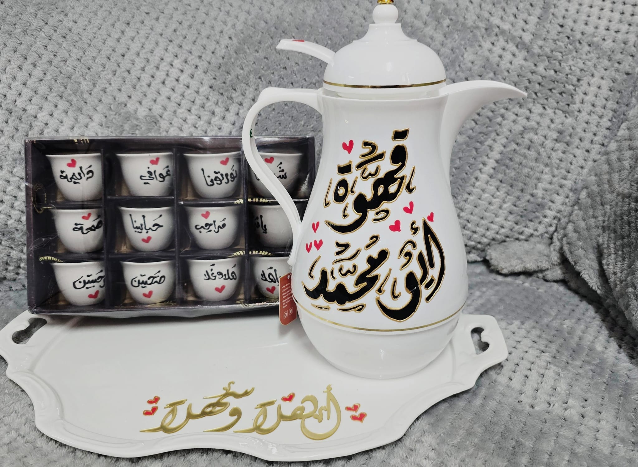 عدد اتنين من ا,لدلات ،.. 1-وحده باسم قهوة ابو محمد مع 12 فنجان وصينية... 2- دلة قهوة مع 12 فنجان مع الصينيه اسم قهوة ابو محمود...