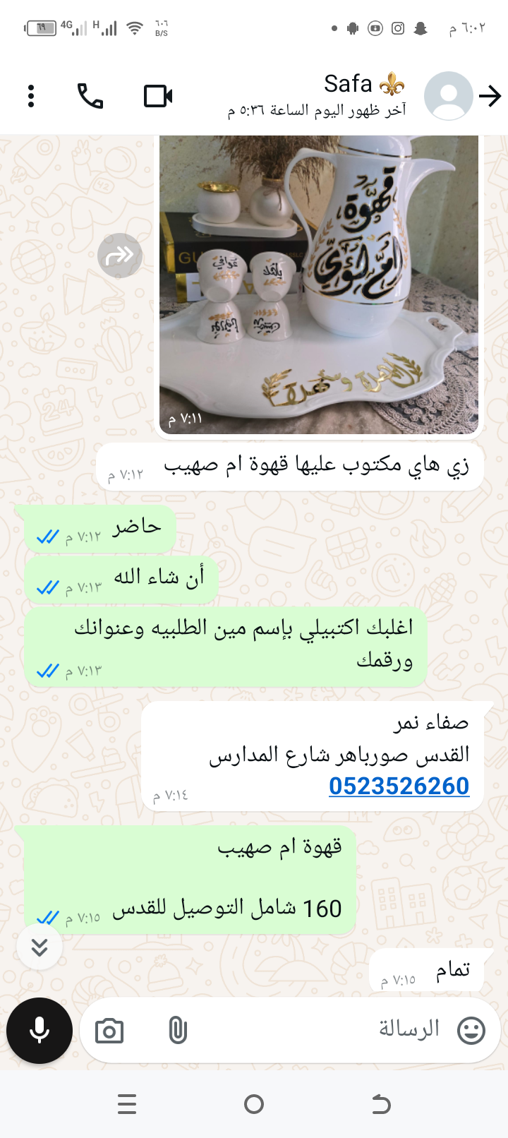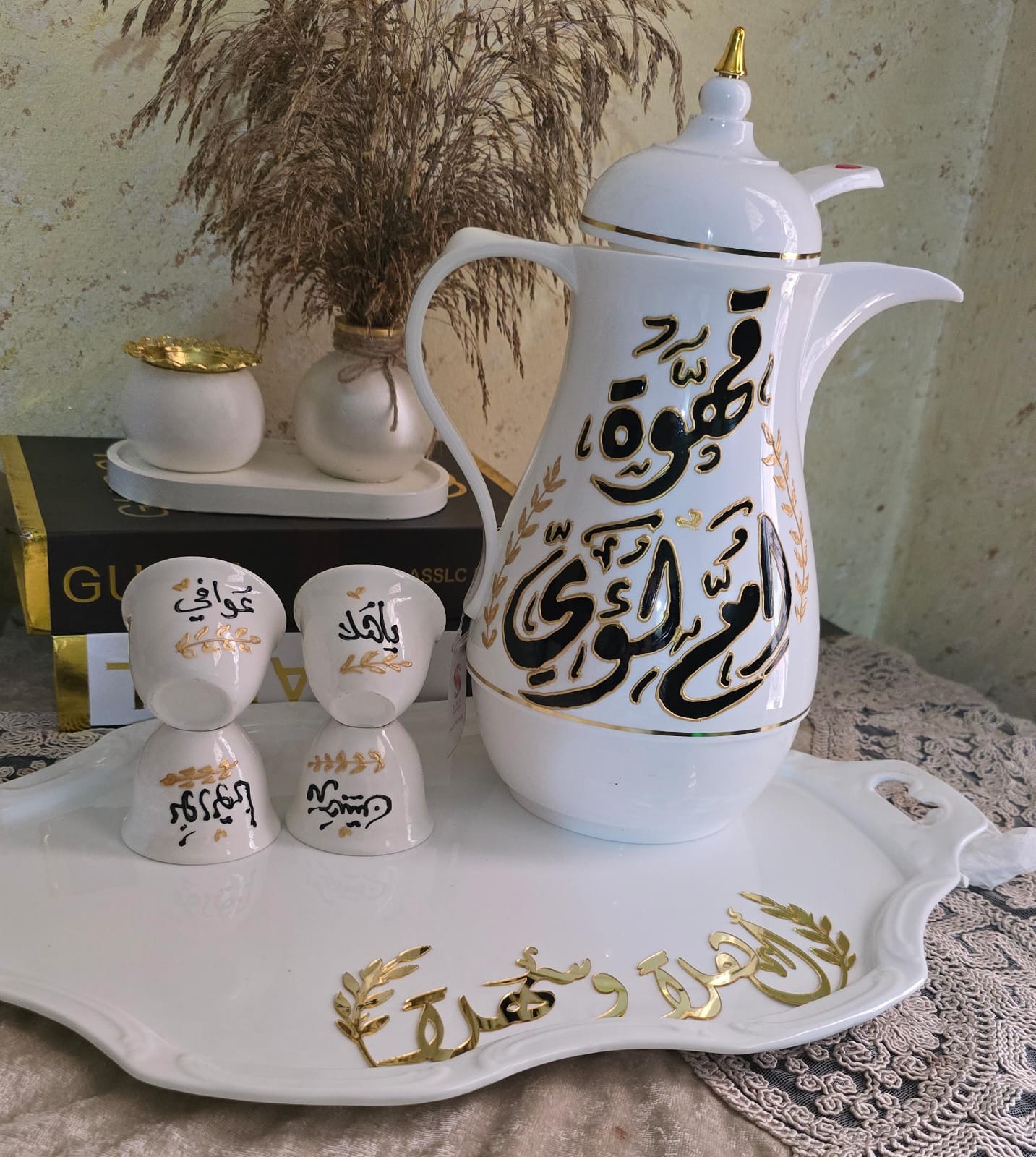 دلة قهوة مع 12 فنجان مع الصينيه اسم قهوة ام صهيب
