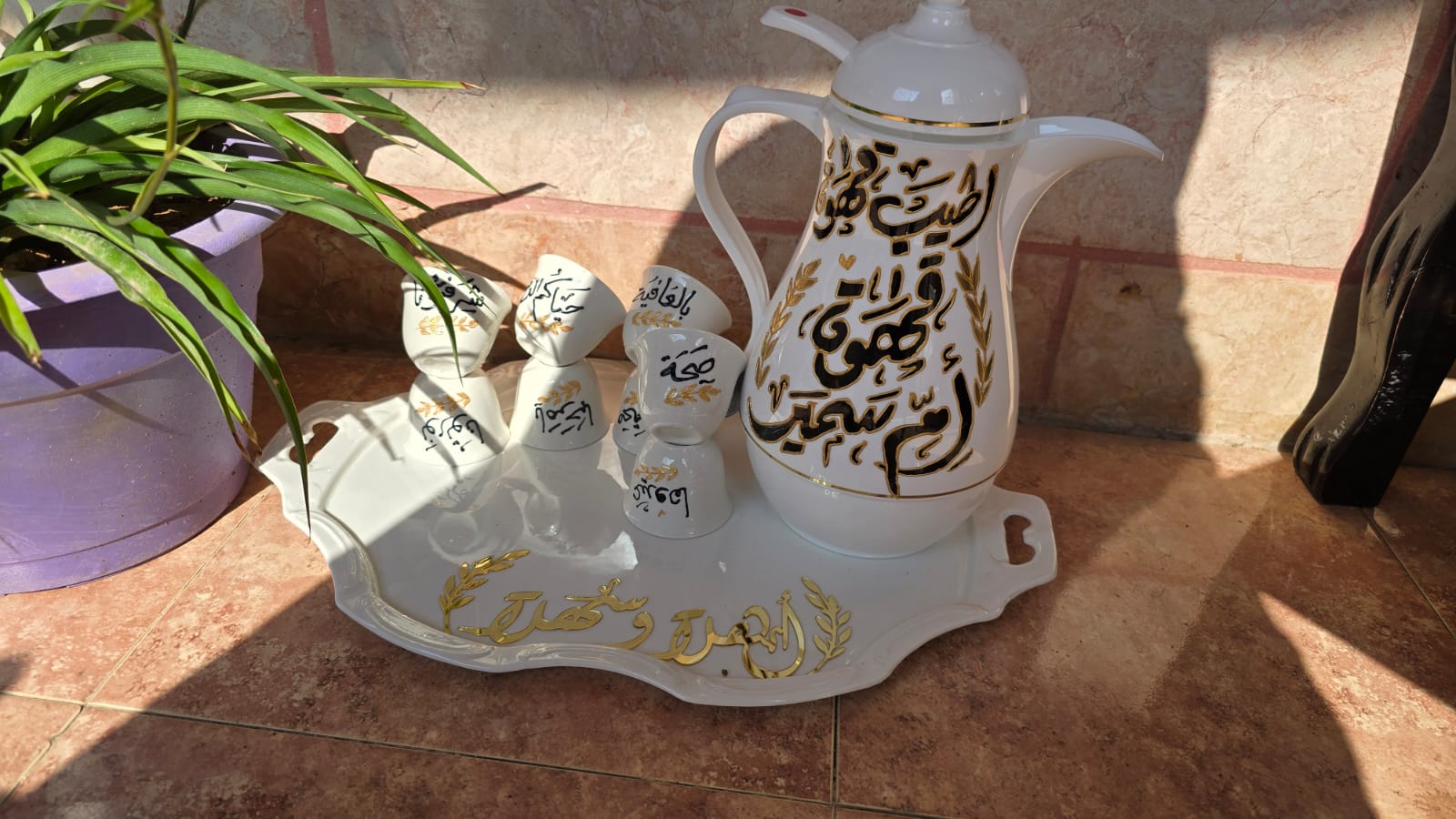 دلة القهوة مع 12 فنجان مع الصينيه اسم اطيب قهوة قهوة ابو عمير