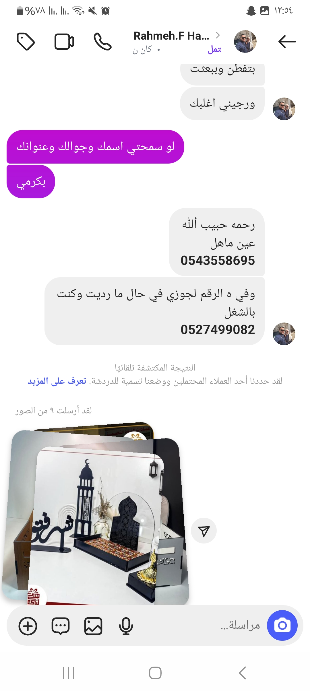 اسم الزبون رحمه حبيب ألله مندوبه إسراء