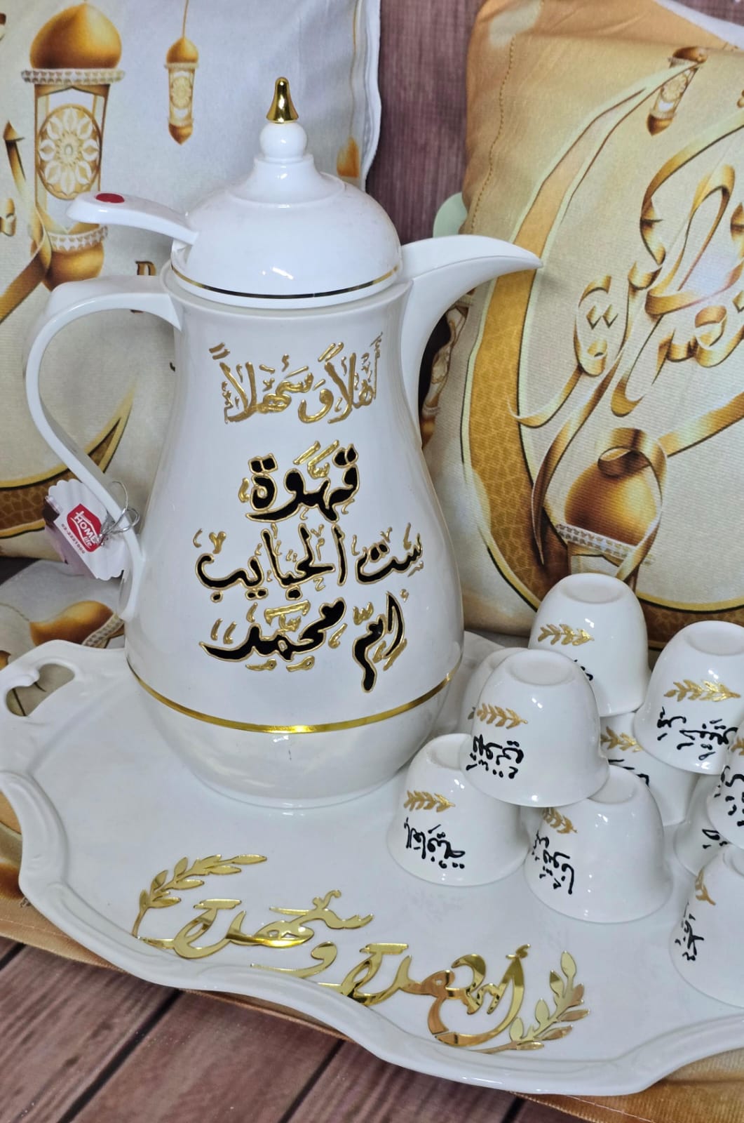 دلة القهوة مكتوب عليها اهلا وسهلا قهوة ست الحبايب أم محمد مع 12 فنجان مكتوب عليهم مع صينية مكتوب عليها اهلا وسهلا