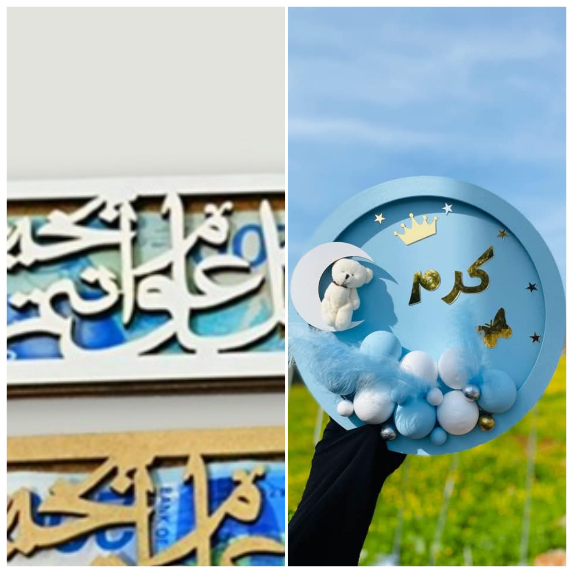 2-تعليقة بيبي دائريه لون ازرق الاسم كرم لون الاسم دهبي مع الاشكال