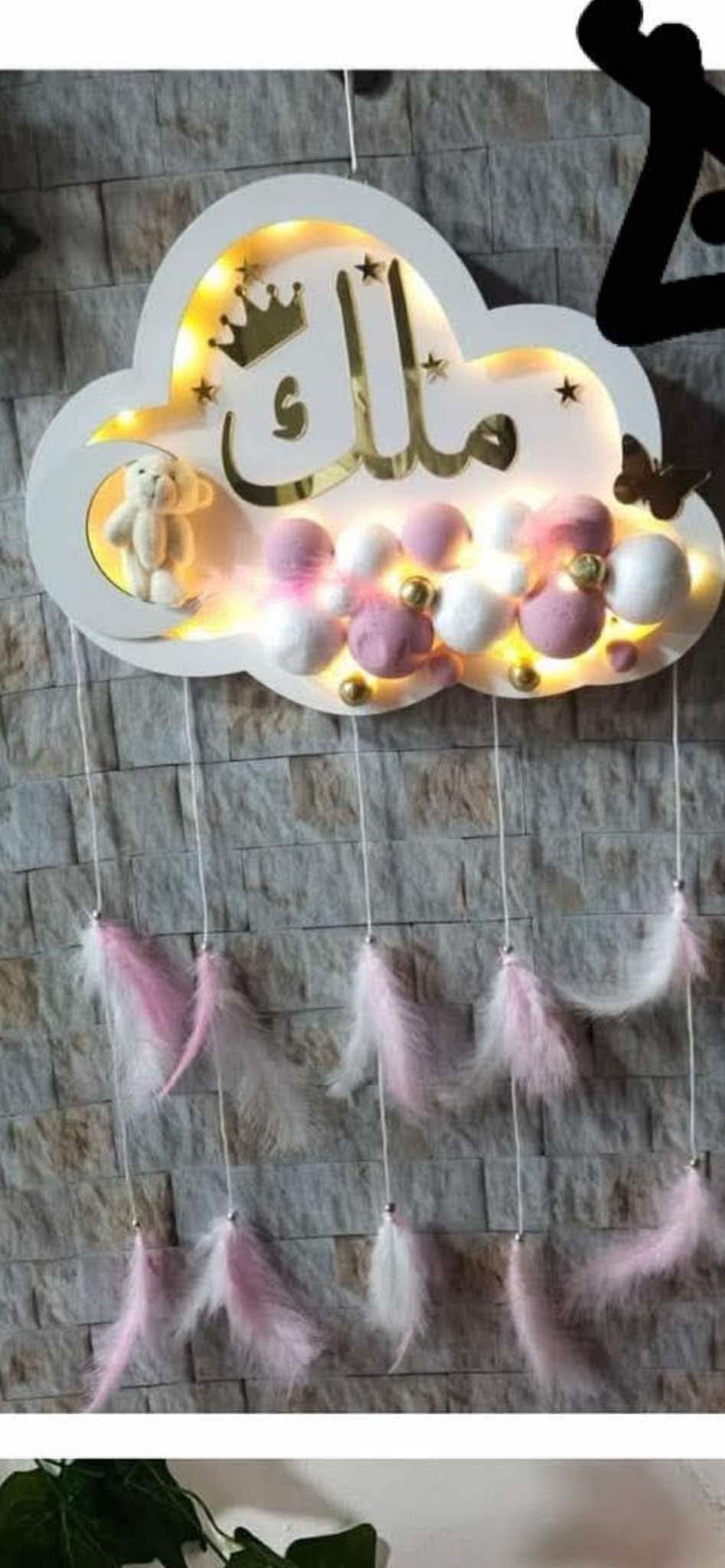 تعليقة غيمه لون ابيض مع كرات زهري الاسم اسماء لون الاسم ذهبي مع الاشكال