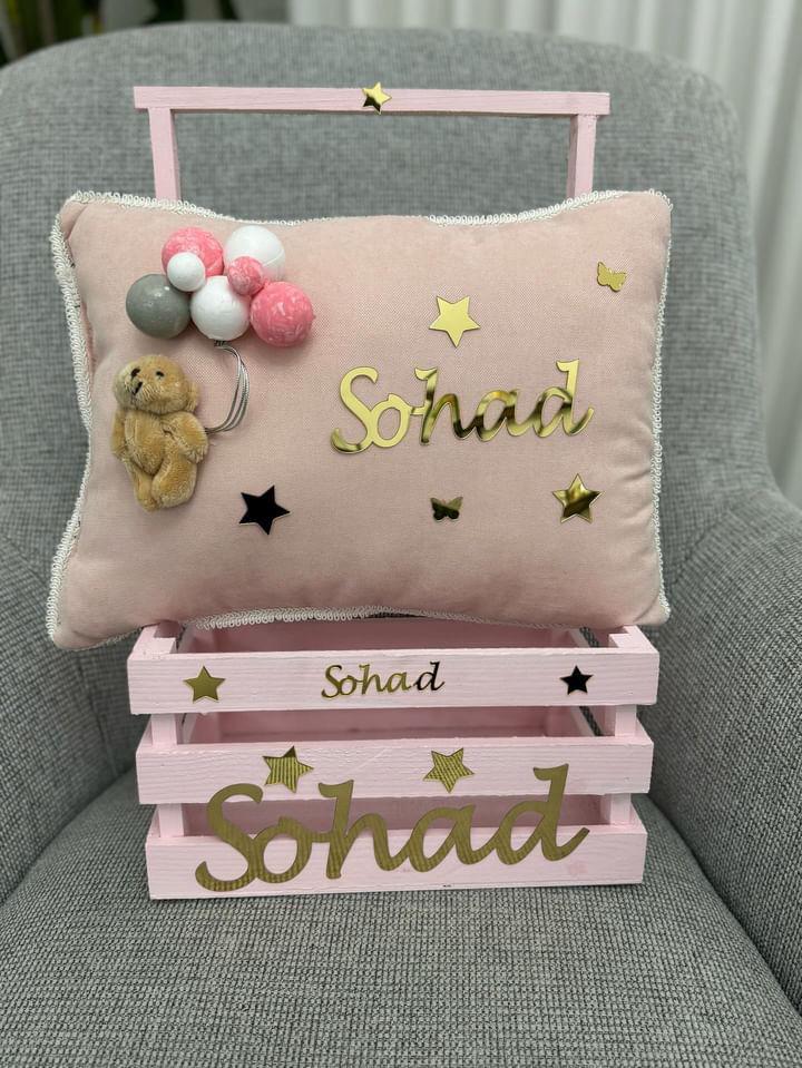 صندوق جهاز البيبي مع اسم رفيف لون زهري والاسم لون دهبي اكرليك ....+ مخدة لون زهري الاسم رفيف لون الاسم ذهبي مع الاشكال