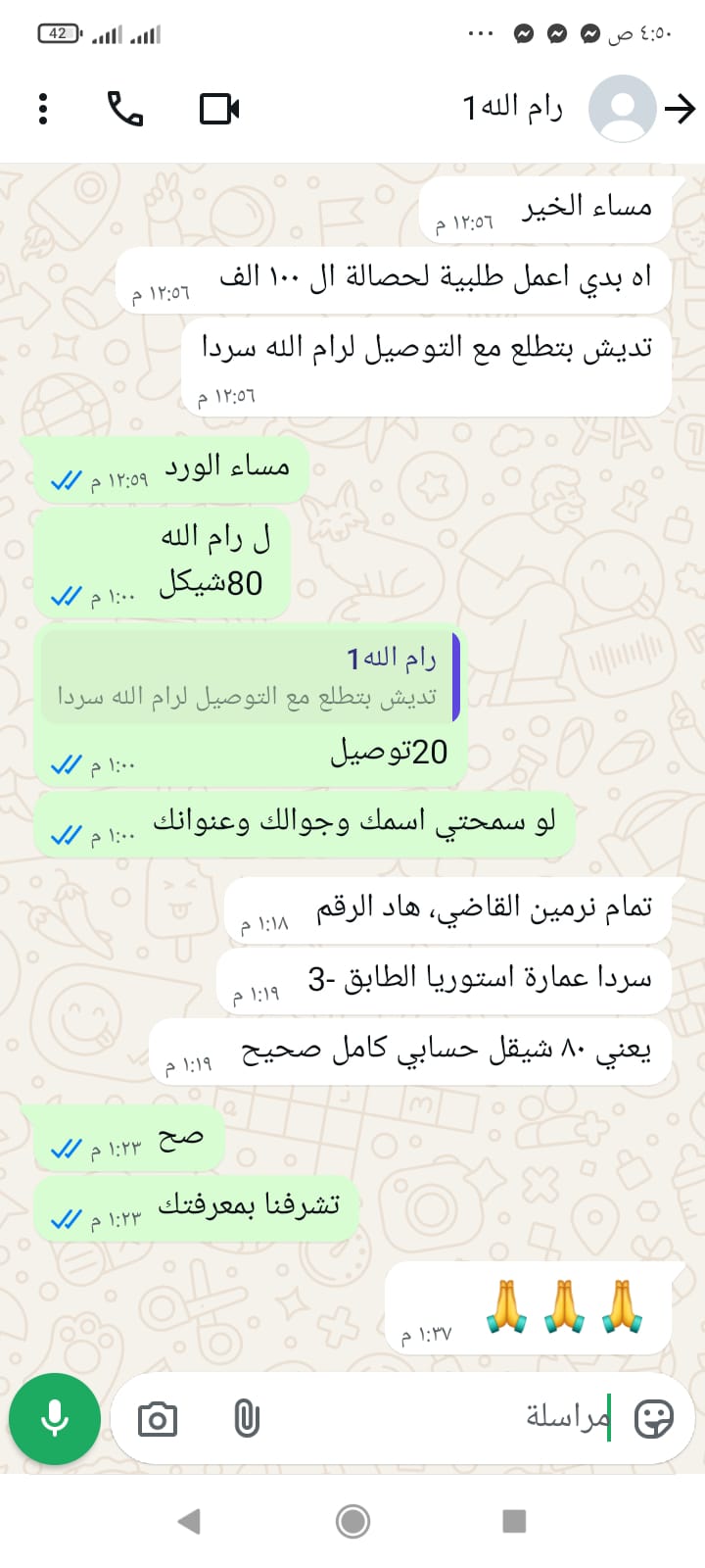 اسم الزبون تمام نرمين القاضي،مندوبه إسراء