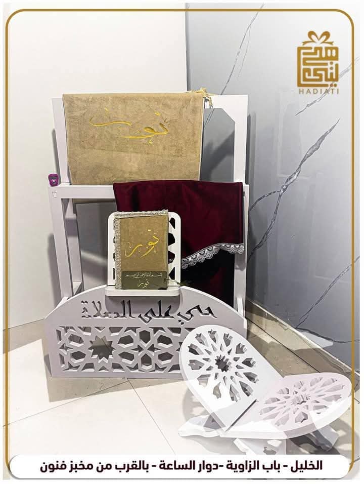 ركن صلاه لون ابيض مع بكج قران كريم ومصليه لون بيج مكتوب عليها علاء