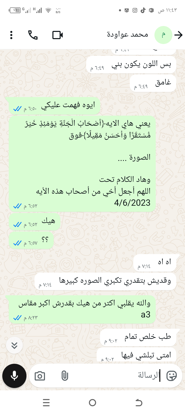 نفس هاي الكتابة عليها مع صورة ... من فوق الكتابه ..... الايه﴿أَصْحَابُ الْجَنَّةِ يَوْمَئِذٍ خَيْرٌ مُّسْتَقَرًّا وَأَحْسَنُ مَقِيلًا﴾ .... الصورة .... وهاد الكلام تحت اللهم أجعل أخي من أصحاب هذه الأيه 4/6/2023