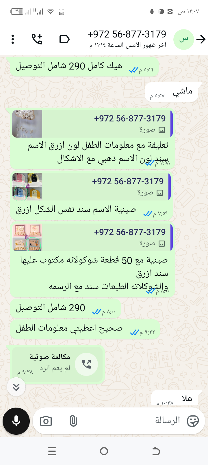 1- تعليقة مع معلومات الطفل لون ازرق الاسم سند لون الاسم ذهبي مع الاشكال ... المعلومات ( تاريخ الميلاد.. ( 7/10/2025 ) ..... ( وقت الولاده .. ( 11:30) ...... ( [١٧/١٠, ١٠:٤٠ م] +972 56-877-3179: وقت ( الولادة ١١:٣٠) ..... ( الوزن ٣ كيلو و٥٠٠جرام ) ..... ( الطول 50 سم ) ...... ............. 2-صينية الاسم سند نفس الشكل ازرق.... ...................... 3- صينية مع 50 قطعة شوكولاته مكتوب عليها سند ازرق والشوكلاته الطبعات سند مع الرسمه