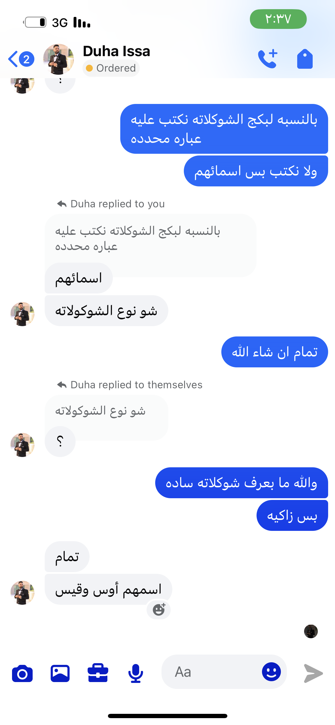 - بكج شوكلاته مع ٢٤ قطعه شوكلاته… الصينية مكتوب عليها أوس وقيس ونفس الشي قطع الشوكلاته ….