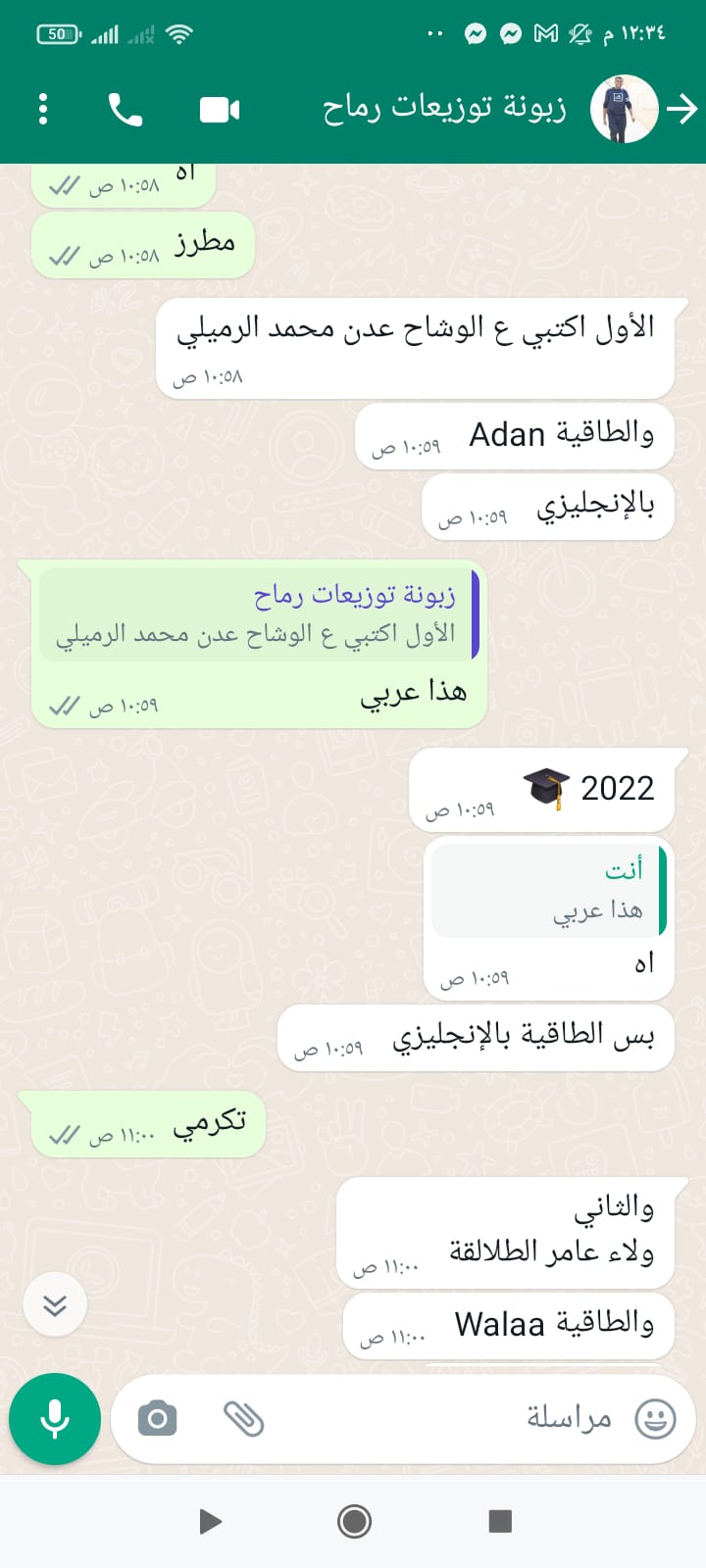 روب تخرج للجامعات لون اسود مخمل مع تطريز عدد 2 مكتوب عليها الأول : عدن محمد الرميلي و2022 والطاقية Adan باللغه الإنجليزي مع تطريز الثاني :ولاء عامر الطلالقة و2022 والطاقية Walaa باللغه الانجليزيه مع تطريز التسليم من المحل السعر0