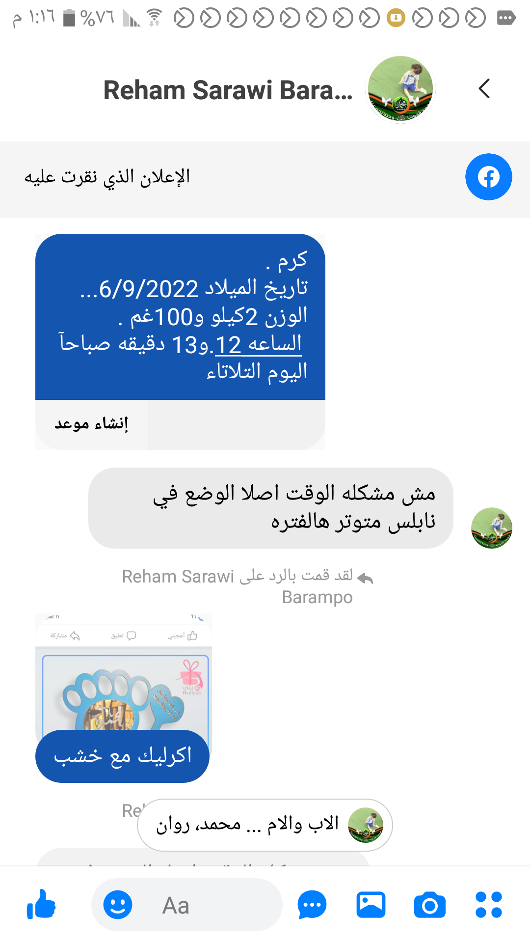 معلومات الطفل اكرليك مع خشب لون ازرق.... كرم . تاريخ الميلاد 6/9/2022... الوزن 2كيلو و100غم . الساعه 12.و13 دقيقه صباحآ اليوم التلاتاء الميداليات الاب والام ... محمد، روان....