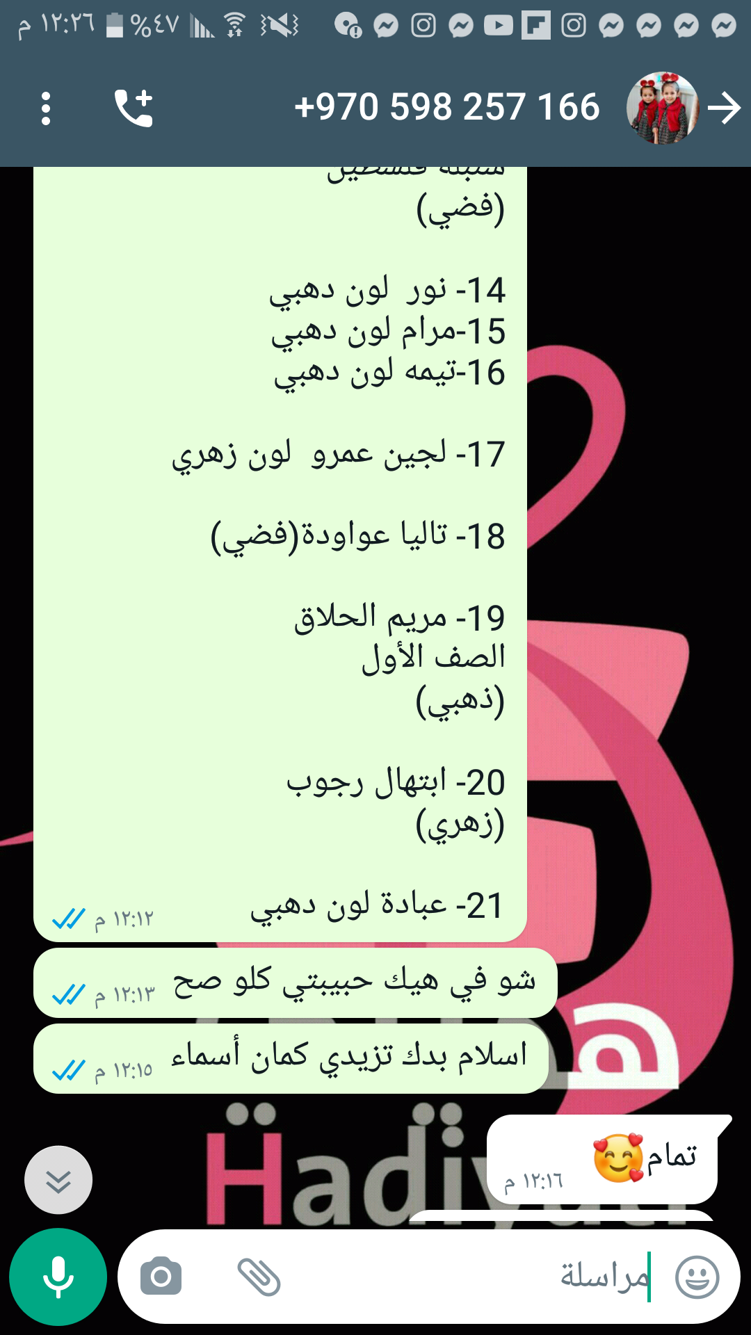 14- نور لون دهبي 15-مرام لون دهبي 16-تيمه لون دهبي 17- لجين عمرو لون زهري 18- تاليا عواودة(فضي) 19- مريم الحلاق الصف الأول (ذهبي) 20- ابتهال رجوب (زهري) 21- عبادة لون دهبي