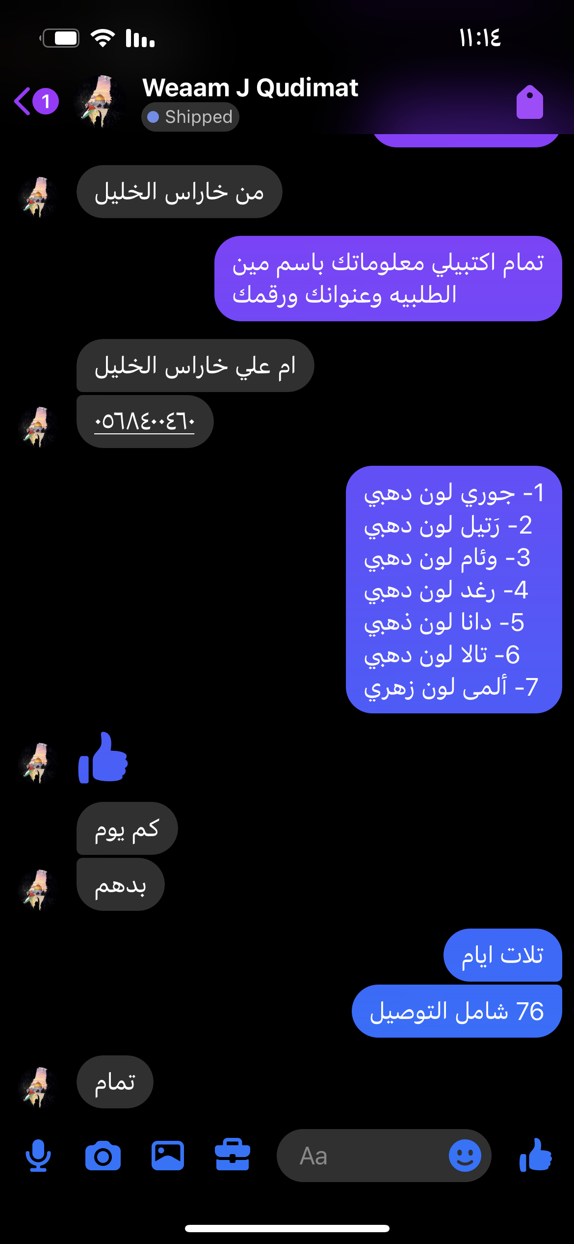 1- جوري لون دهبي 2- رَتيل لون دهبي 3- وئام لون دهبي 4- رغد لون دهبي 5- دانا لون ذهبي 6- تالا لون دهبي 7- ألمى لون زهري كلهم دهبي ما عدا ألمى زهري …. 76 شامل التوصيل