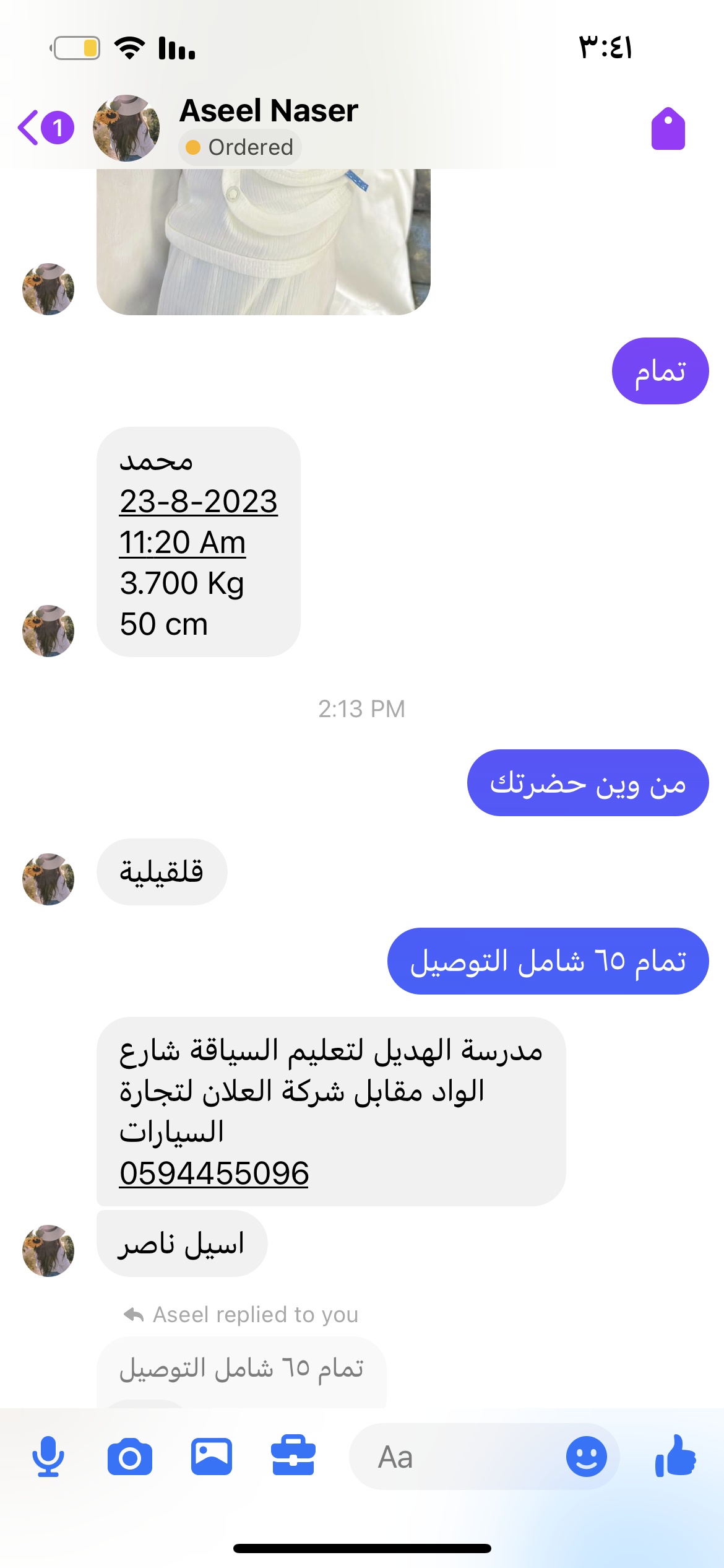 درع معلومات الطفل كلو اكرليك لون ازرق … محمد 23-8-2023 11:20 Am 3.700 Kg 50 cm 65 شامل التوصيل