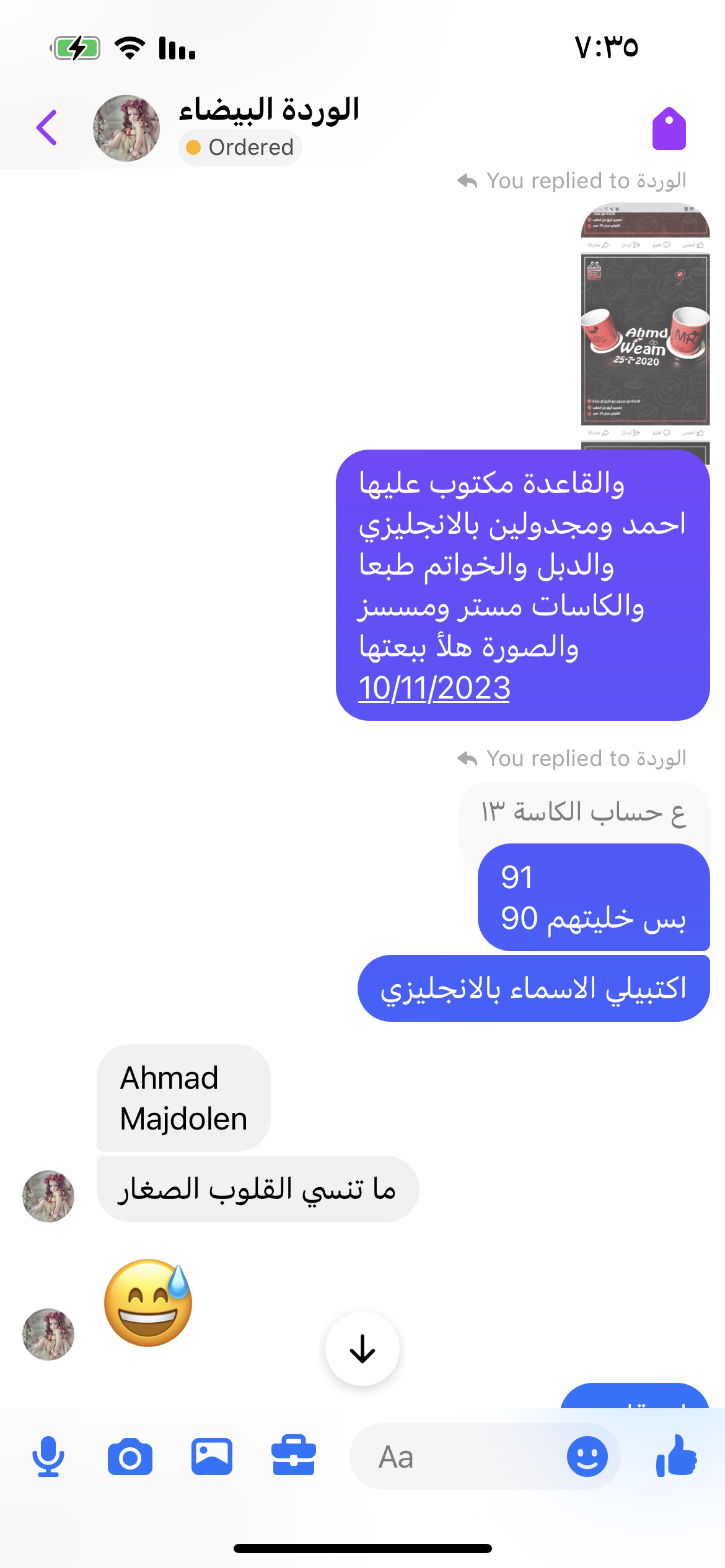 قاعدة مج مزدوج مع تاريخ نفس اللون ومع كاستين …. والقاعدة مكتوب عليها Ahmad Majdolen 10/11/2023 بالانجليزي والدبل والخواتم طبعا والقلوب ما تنسيهم والكاسات MR و MRS والصور هلأ ببعتهم