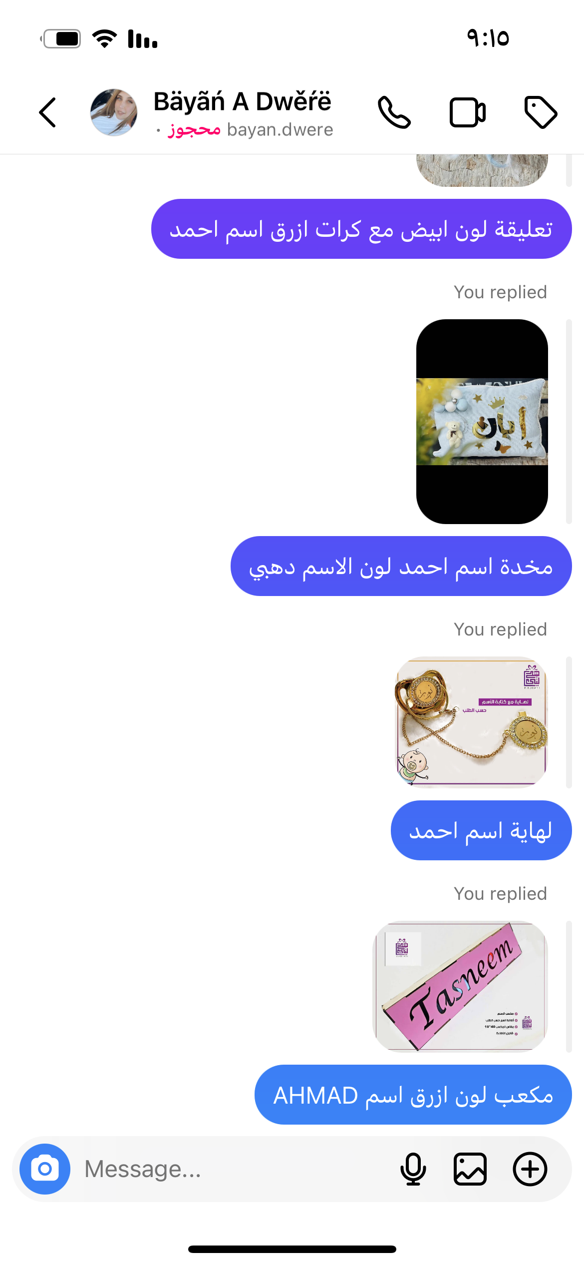 1- تعليقة لون ابيض مع كرات ازرق اسم احمد لون الاسم ذهبي … 2- مخدة اسم احمد لون الاسم دهبي … 3- لهاية اسم احمد.. 4- مكعب لون ازرق اسم AHMAD … 280 شامل التوصيل
