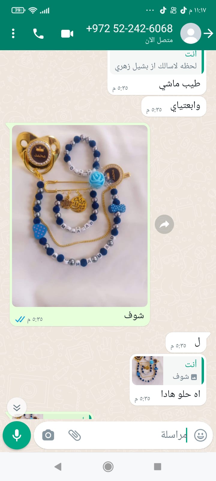بكج بيبي لون ازرق وبكج لهايه مجد باللغه العربيه و اسواره ودبوس مجد باللغه الانجليزيه ع دبوس اكتبي تبارك الله لو سمحت ابو معاويه بدي هديه مداليا بالاسم ايناس شامل توصيل 150شيكل