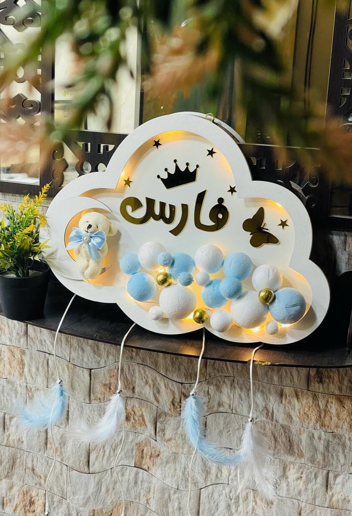 تعليقه لون ابيض مع كرات ازرق الاسم Hasan لون الاسم دهبي مع الاشكال …