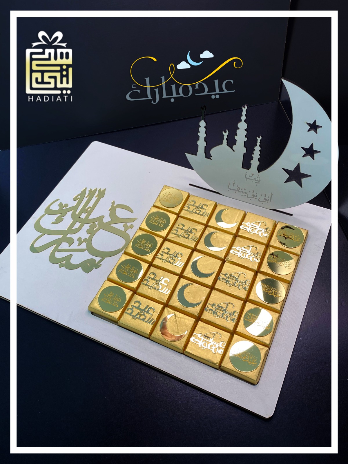 صنية شوكلاته عدد 2 مع شوكلاته بس الزبونه طلبت نلغي الهلال نهائي ونكتب كلمة عيد مبارك بخط اصغر شوي وتحتها ... ع الاولى ضيافة دار ابو ايوب .... والتانيه ضيافة بنات ام احمد .....