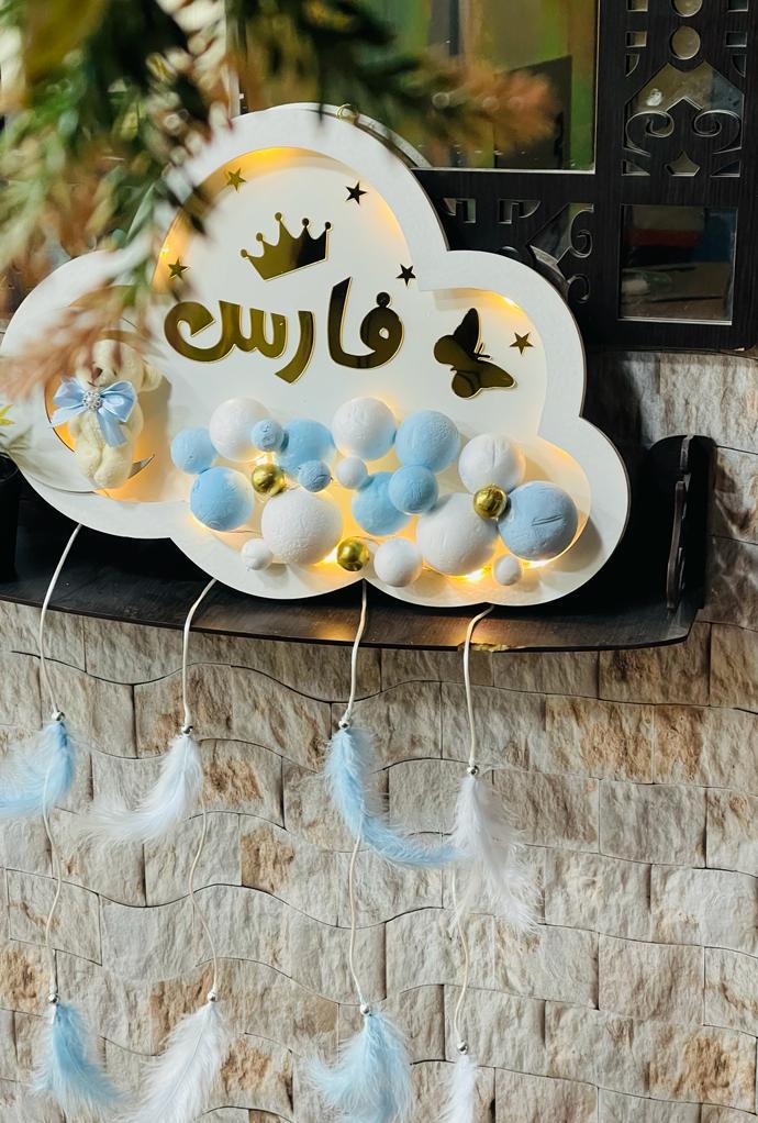 تعليقه لون ابيض مع كرات ازرق الاسم تيم لون الاسم دهبي مع الاشكال
