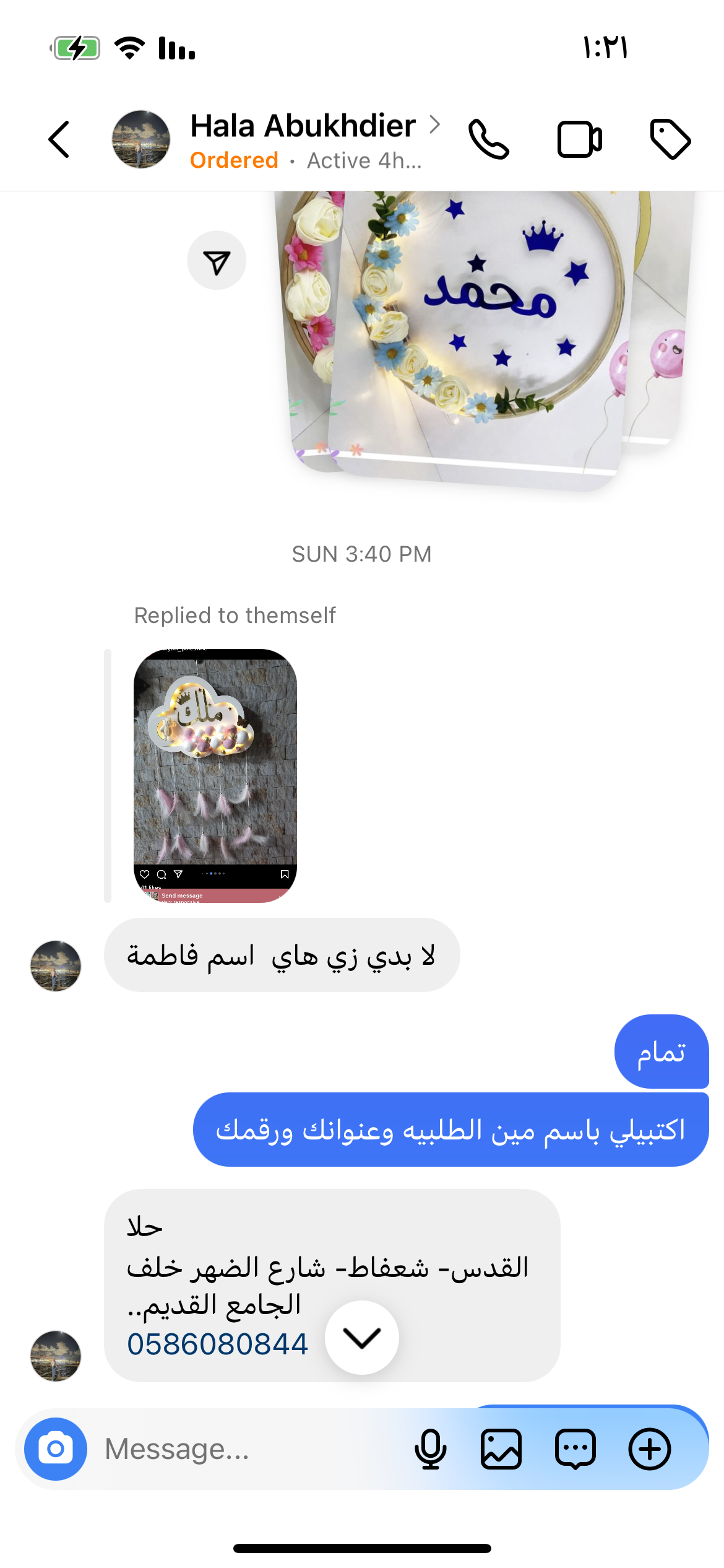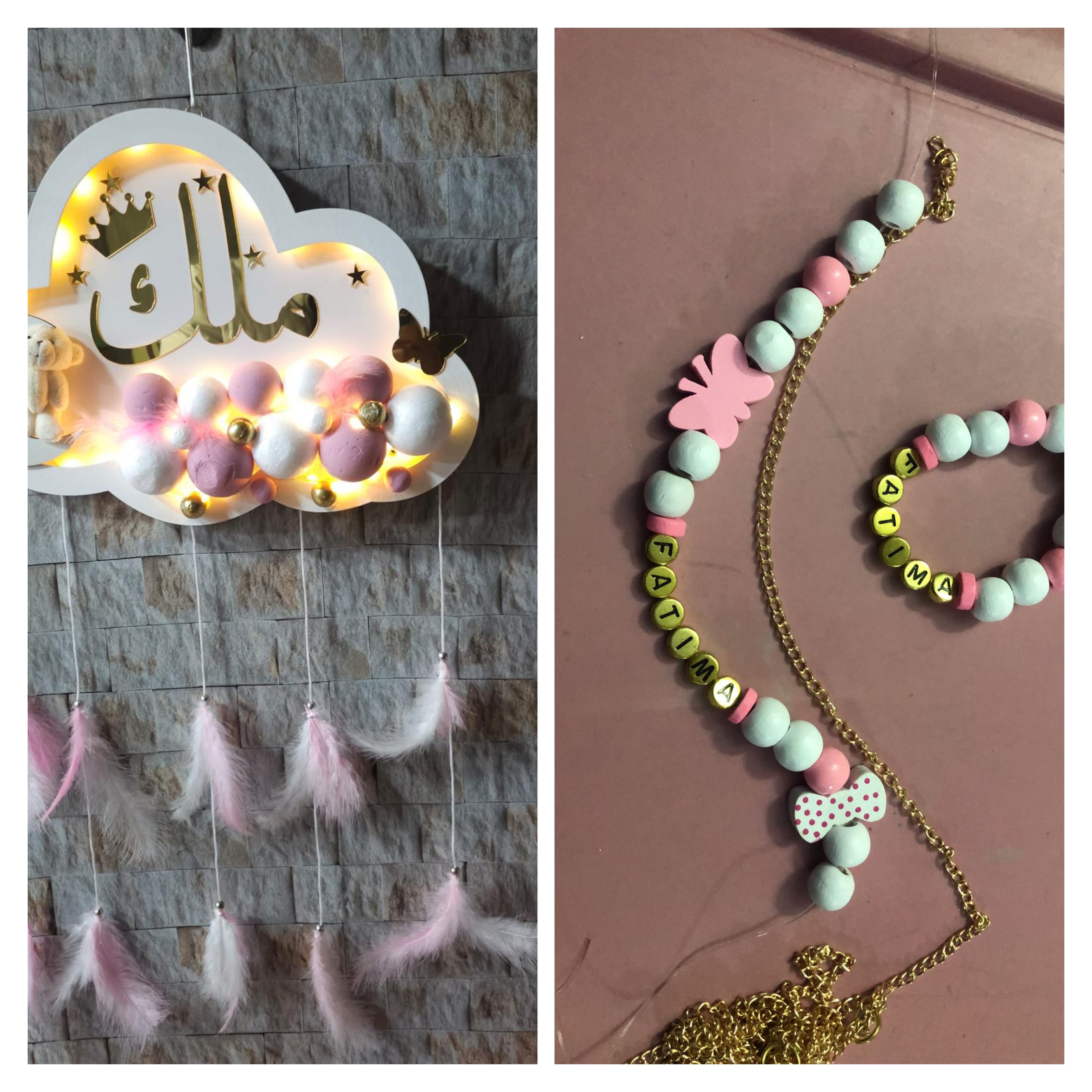 تعليقه لون ابيض مع كرات زهري الاسم فاطمة لون الاسم دهبي مع الاشكال