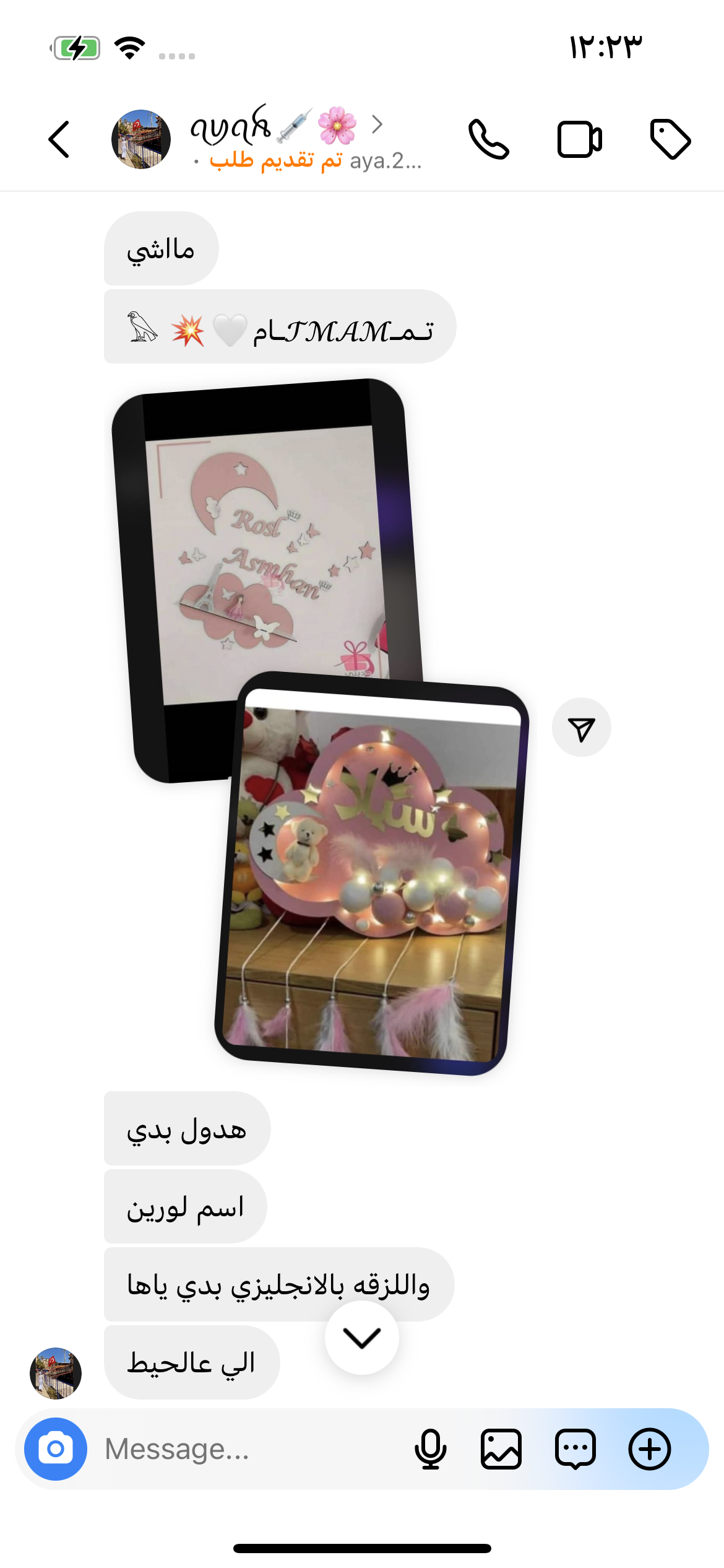 1- تعليقة غيمه لون زهري الاسم لورين بالعربي لون الاسم دهبي مع الاشكال….