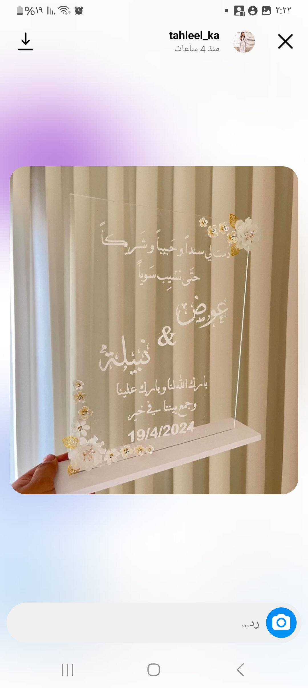 لافته عرس لون خط ابيض وقاعده ابيض والحجم 25،35نفس الي بصوره مكتوب عليها الخط واضح مع زينه ناعمه قبلت لك شريكاًلحياتي وصديقاً لايامي وحبيباًلروحي تهليل ومحمود بارك الله لناوبارك علينا وجمع بيننا في خير 182024 سعرها 100 شيكل المجموع 240شيكل