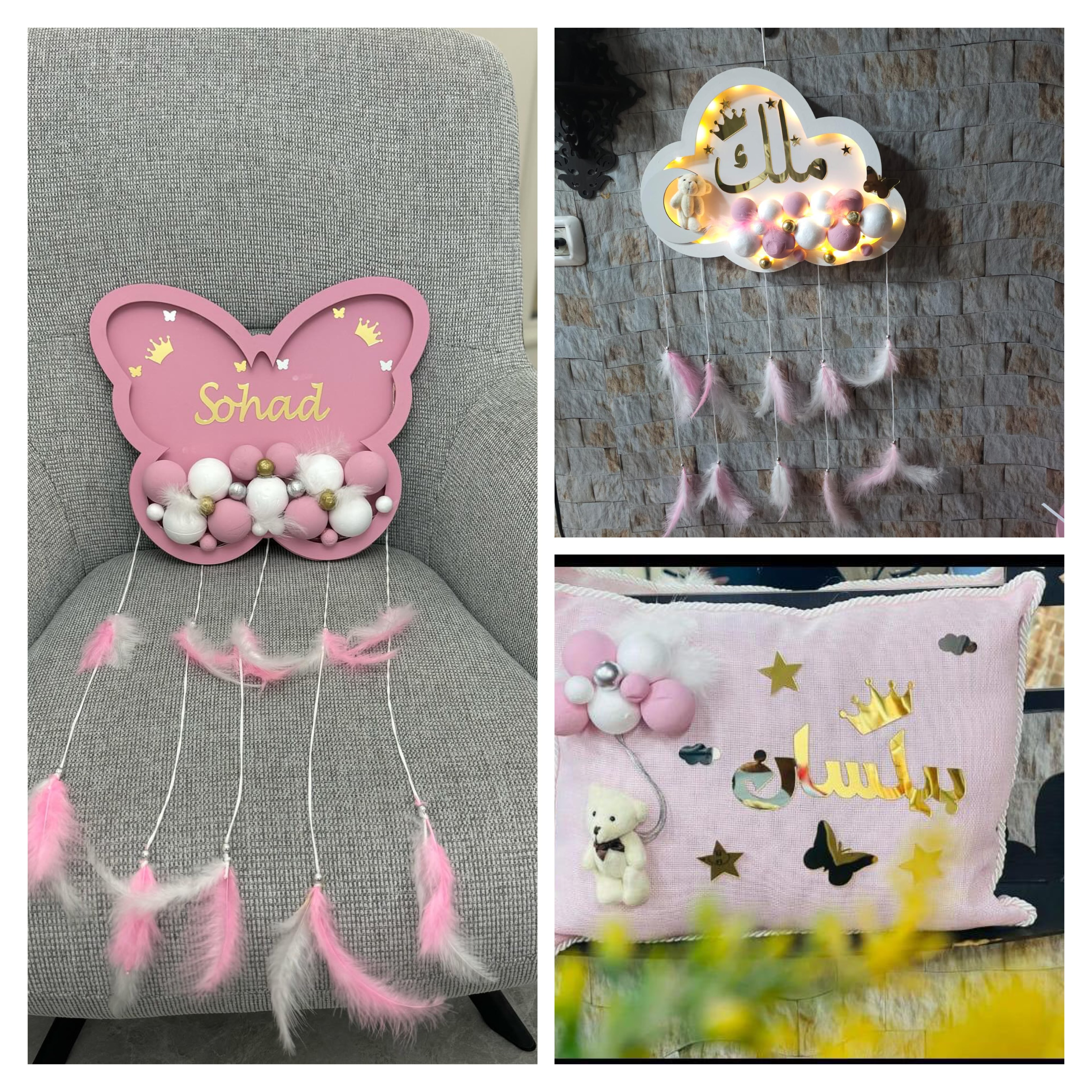 3- تعليقة على شكل فراشه لون زهري الاسم امل لون الاسم دهبي مع الاشكال ,,,,