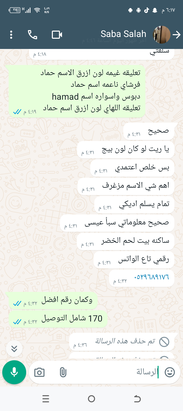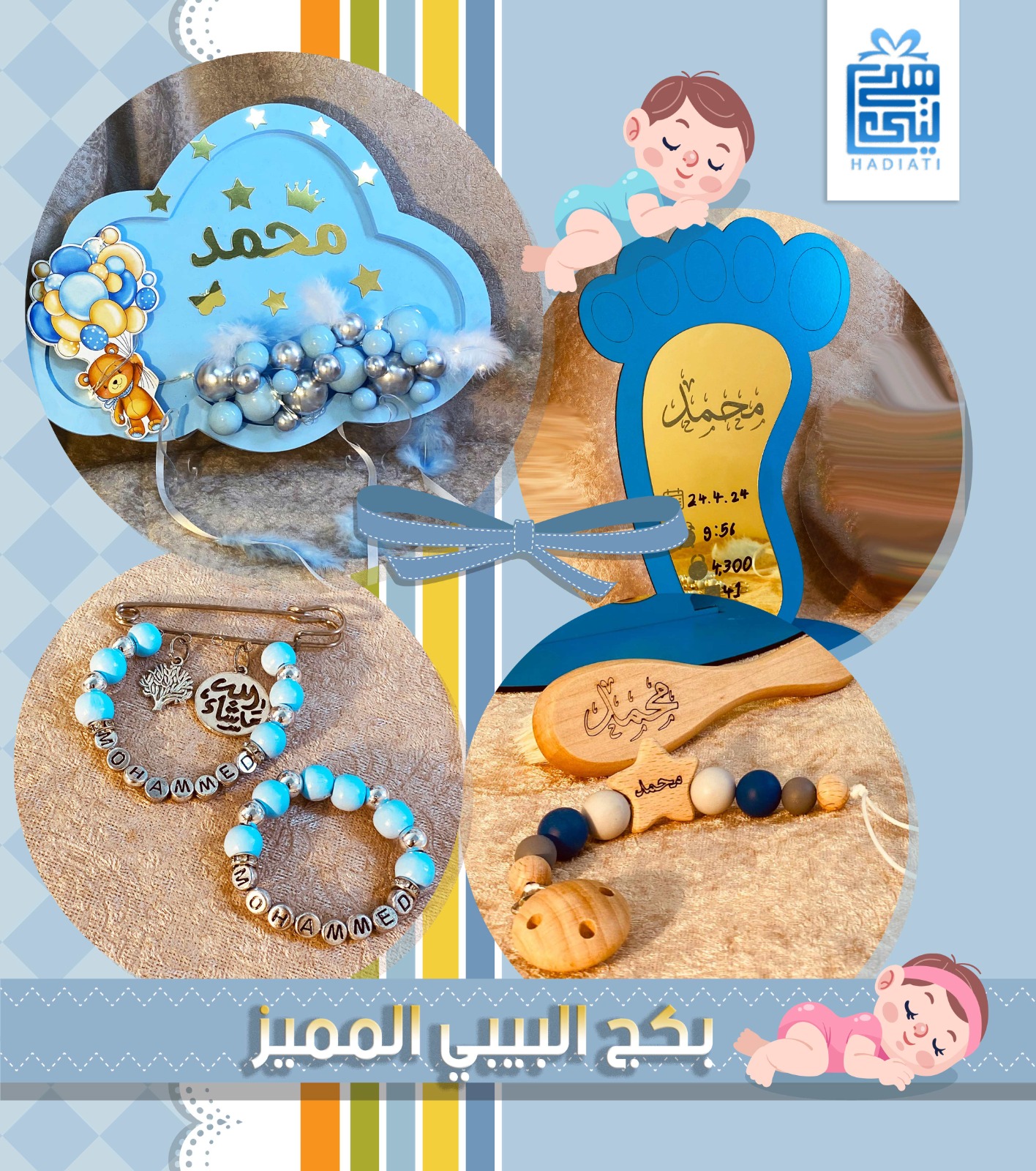بكج البيبي نفس يلي بالصوره ،،،، 1-تعليقه غيمه لون ازرق الاسم حماد الاسم مزخرف يكون لون الاسم دهبي مع الاشكال 2-فرشاي ناعمه اسم حماد 3-دبوس واسواره اسم hamad 4-تعليقه اللهاي لون ازرق اسم حماد 170