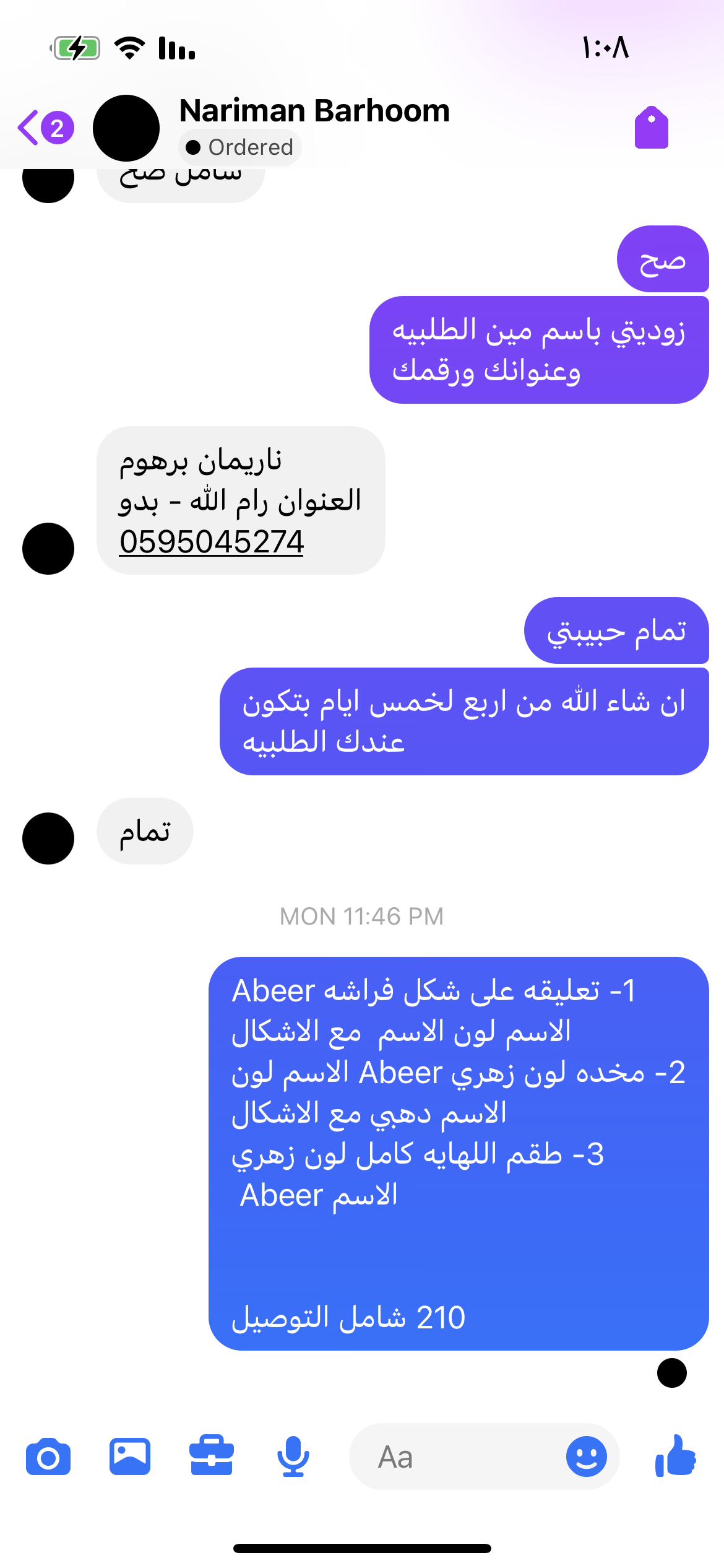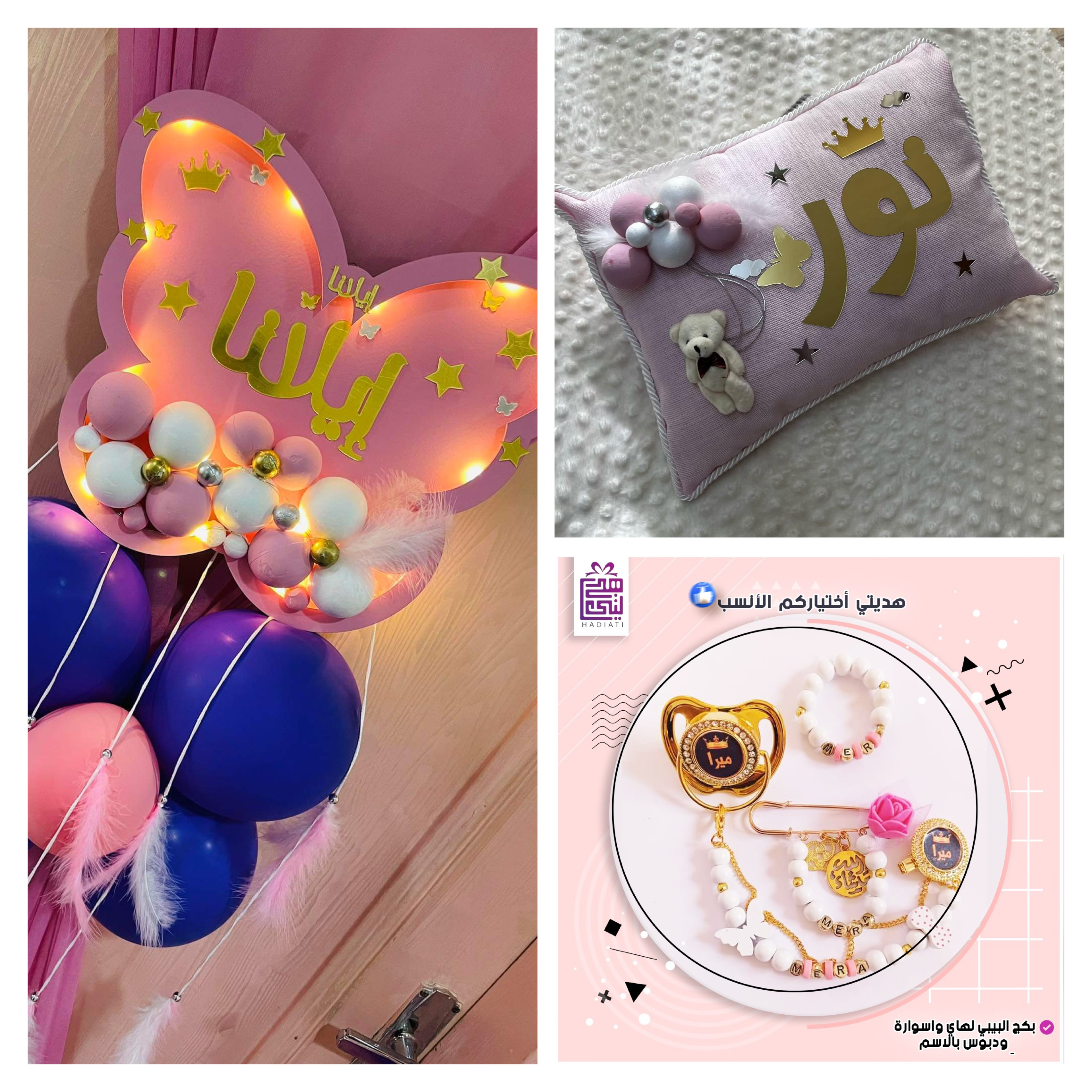 1- تعليقه على شكل فراشه Abeer الاسم لون الاسم دهبي مع الاشكال … 2- مخده لون زهري Abeer الاسم لون الاسم دهبي مع الاشكال ….. 3- طقم اللهايه كامل لون زهري Abeer الاسم 210 شامل التوصيل