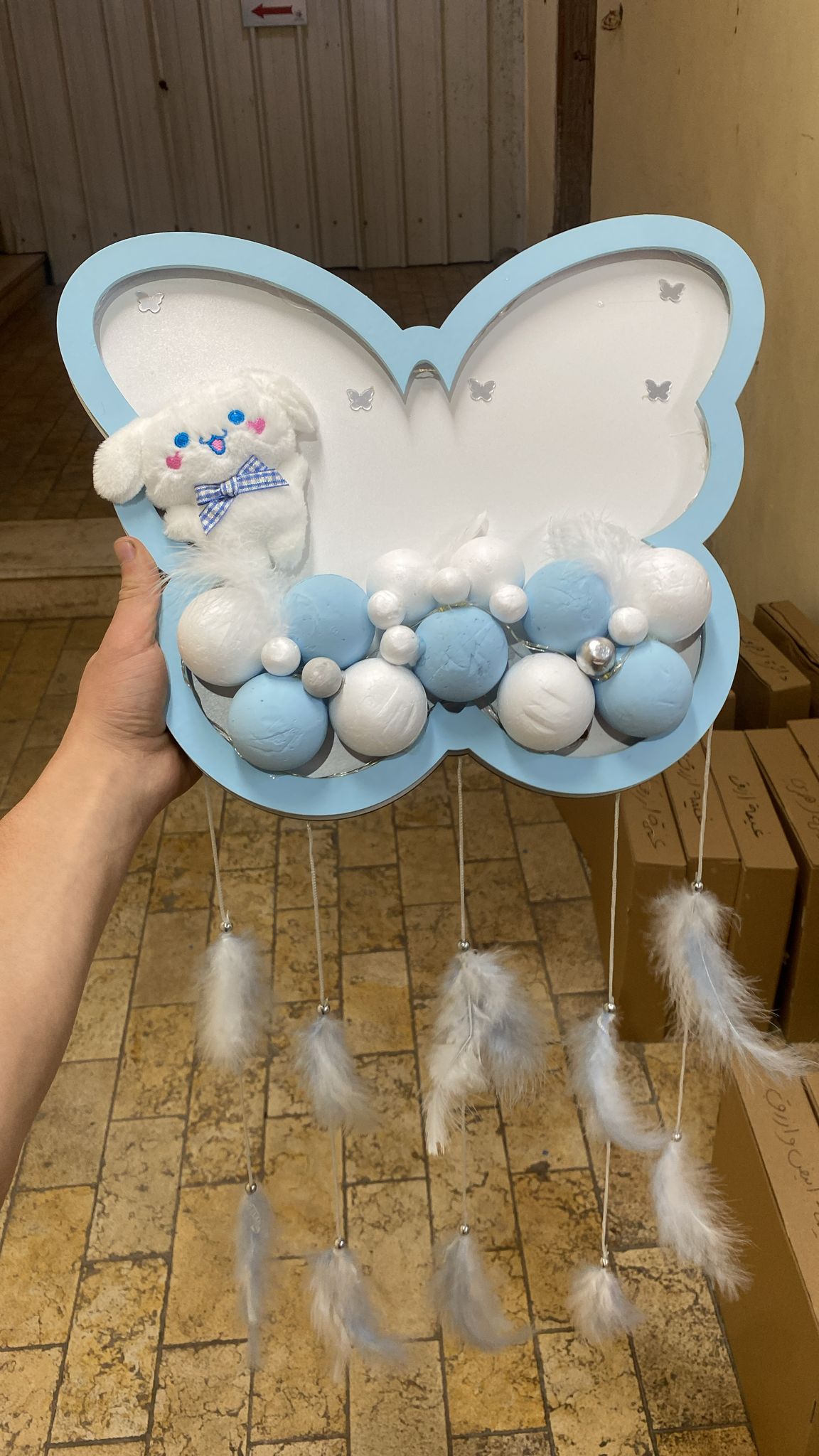 تعليقه على شكل فراشه لون ازرق مع ابيض الاسم زين لون الاسم دهبي مع الاشكال