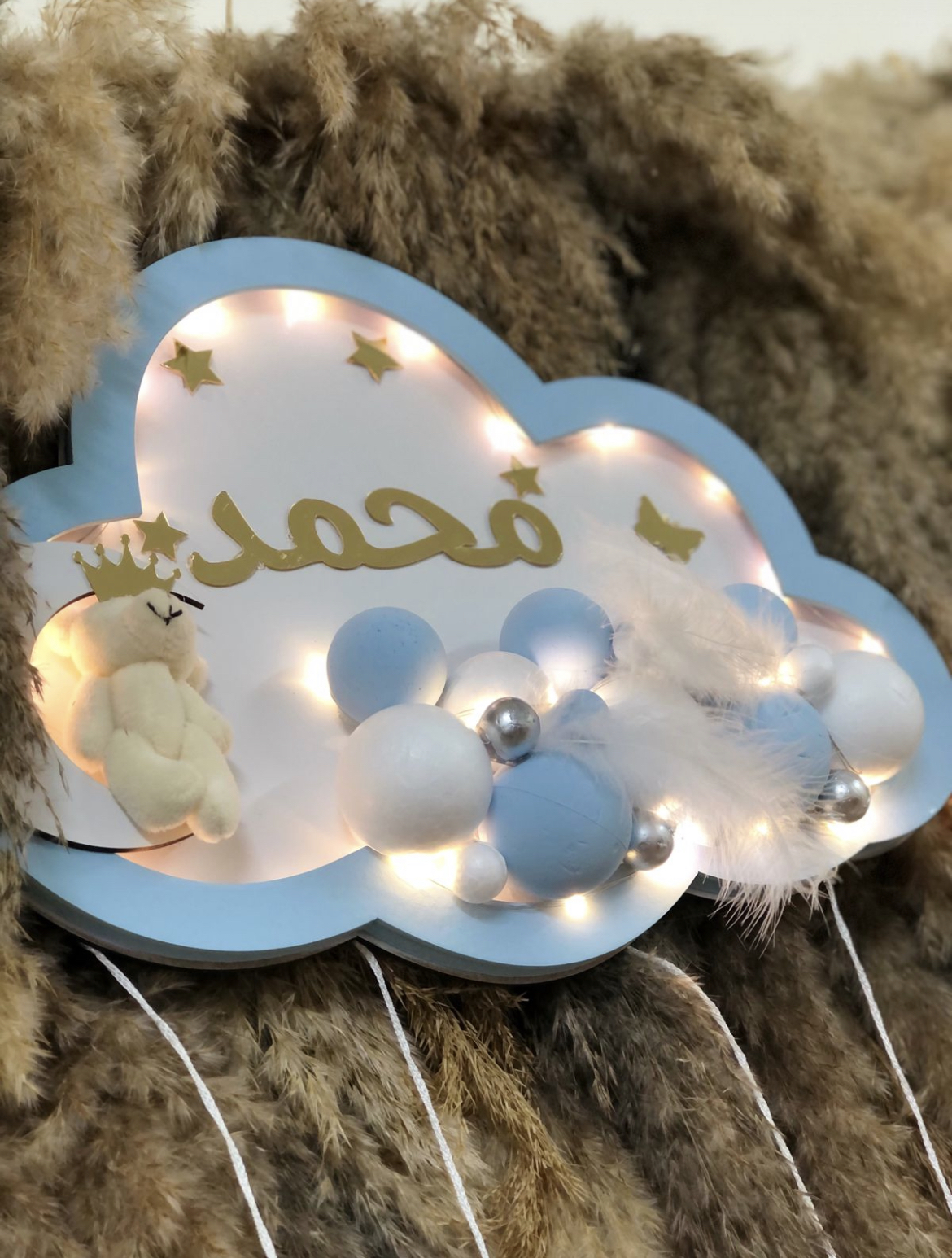 تعليقه غيمه نفس الشكل الضهر ابيض وع الحواف ازرق لون الاسم دهبي مع الاشكال