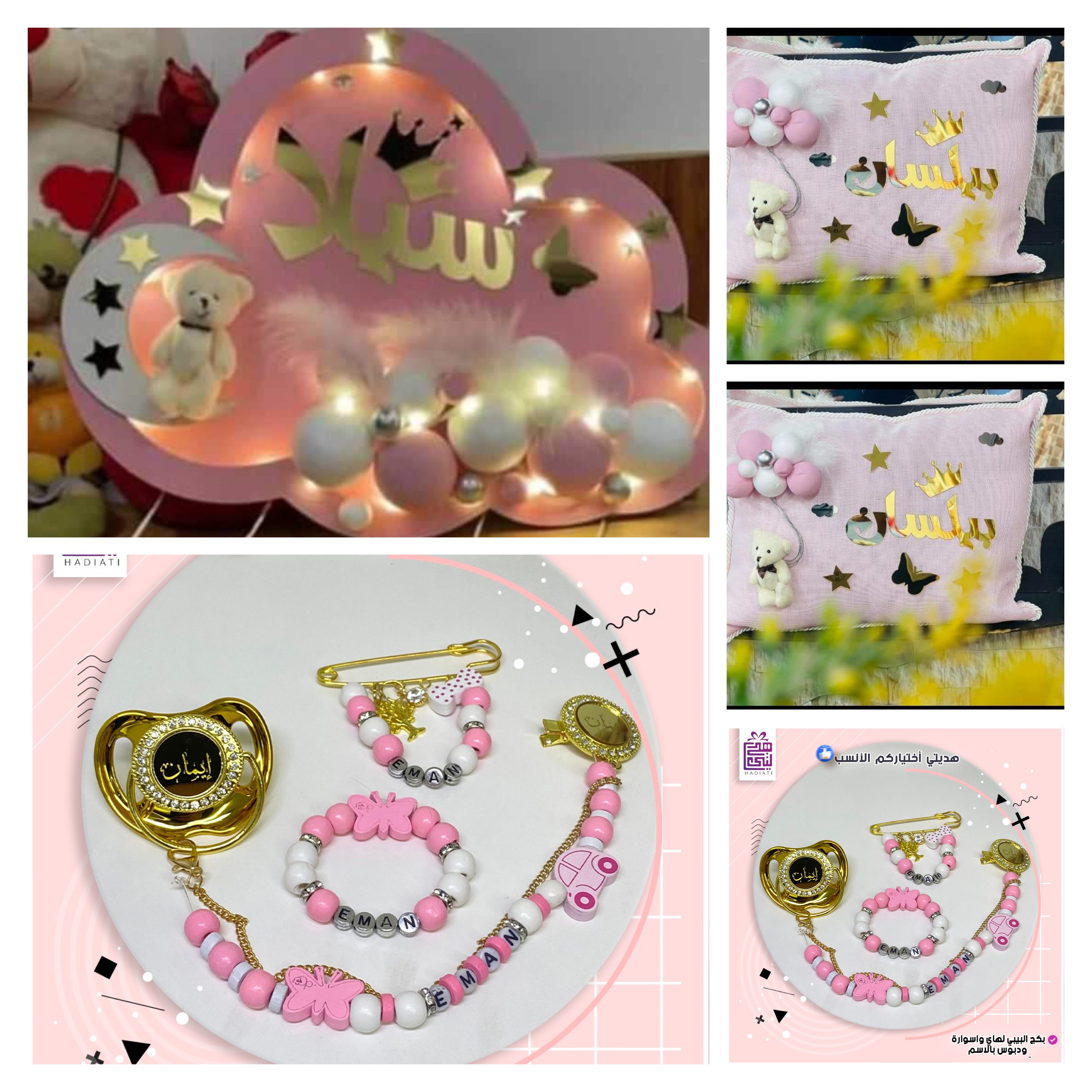1- مخدتين وحدة بإسم ايلياء و وحدة بإسم اليسار لون الاسماء دهبي مع الاشكال …….