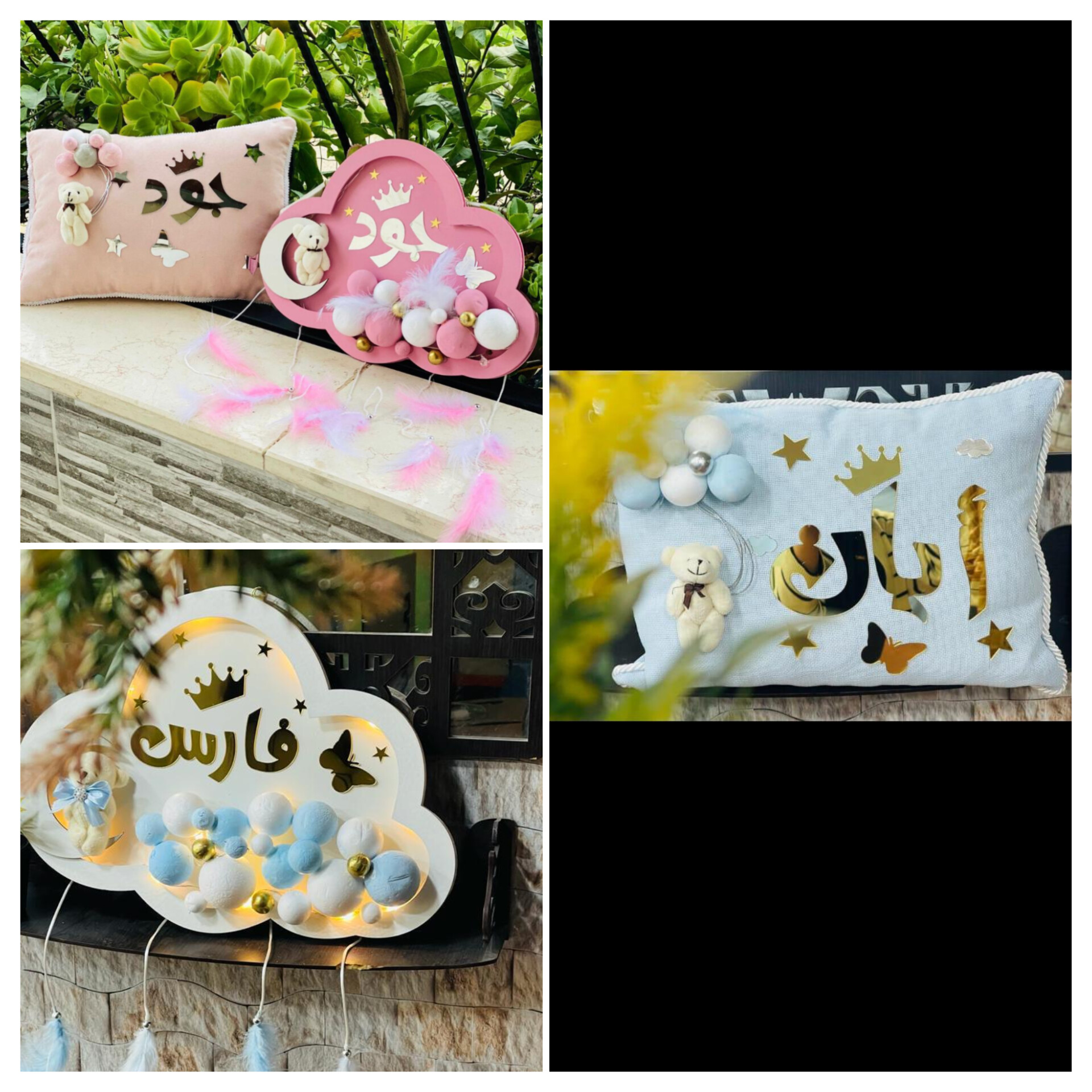 4- مخدة لون ازرق الاسم جود لون الاسم دهبي مع الاشكال