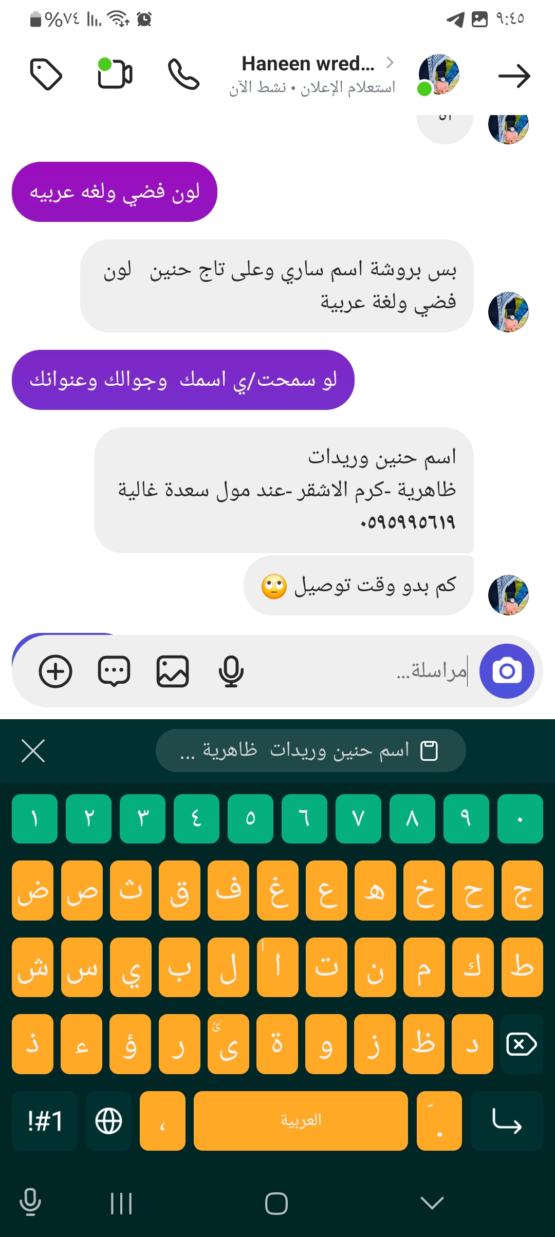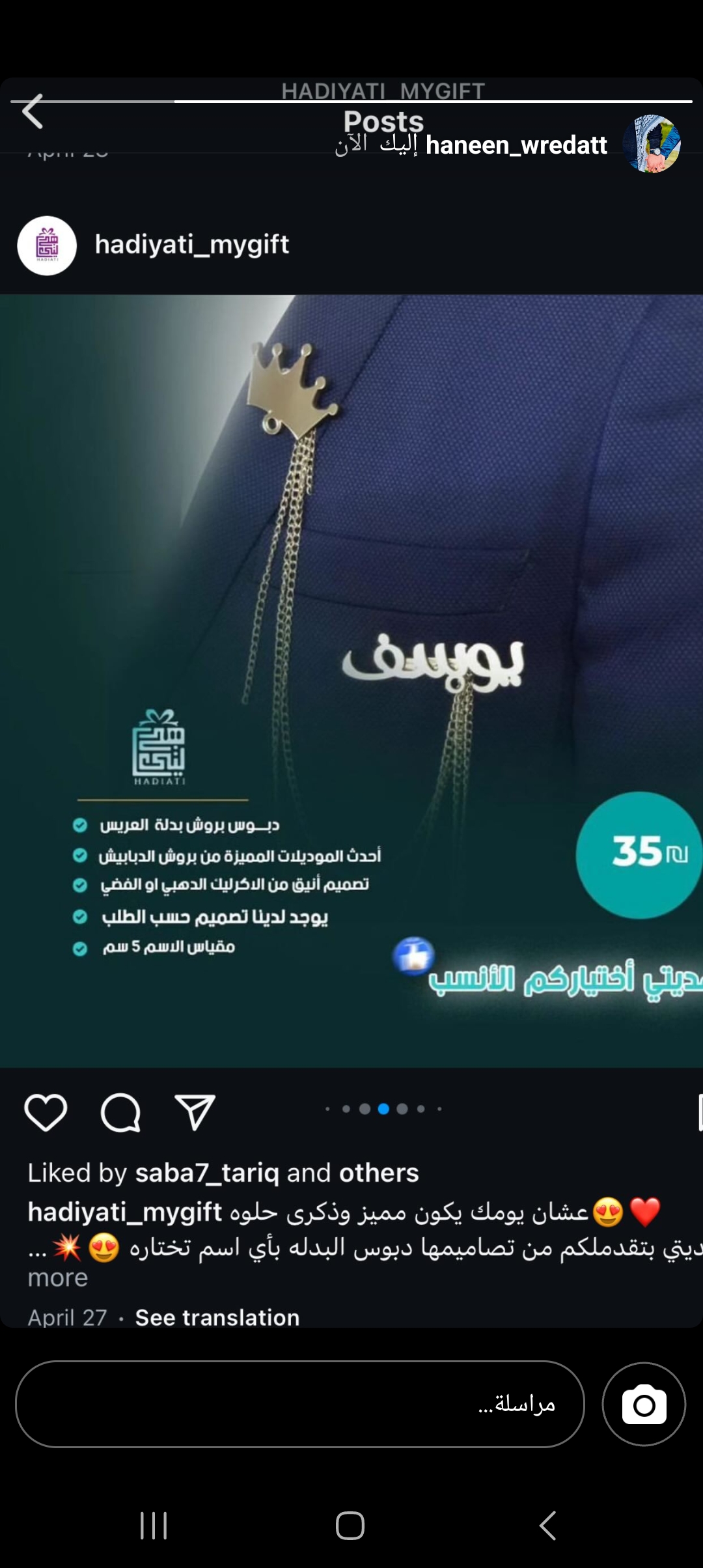 بس بروشة اسم ساري وعلى تاج حنين لون فضي ولغة عربية