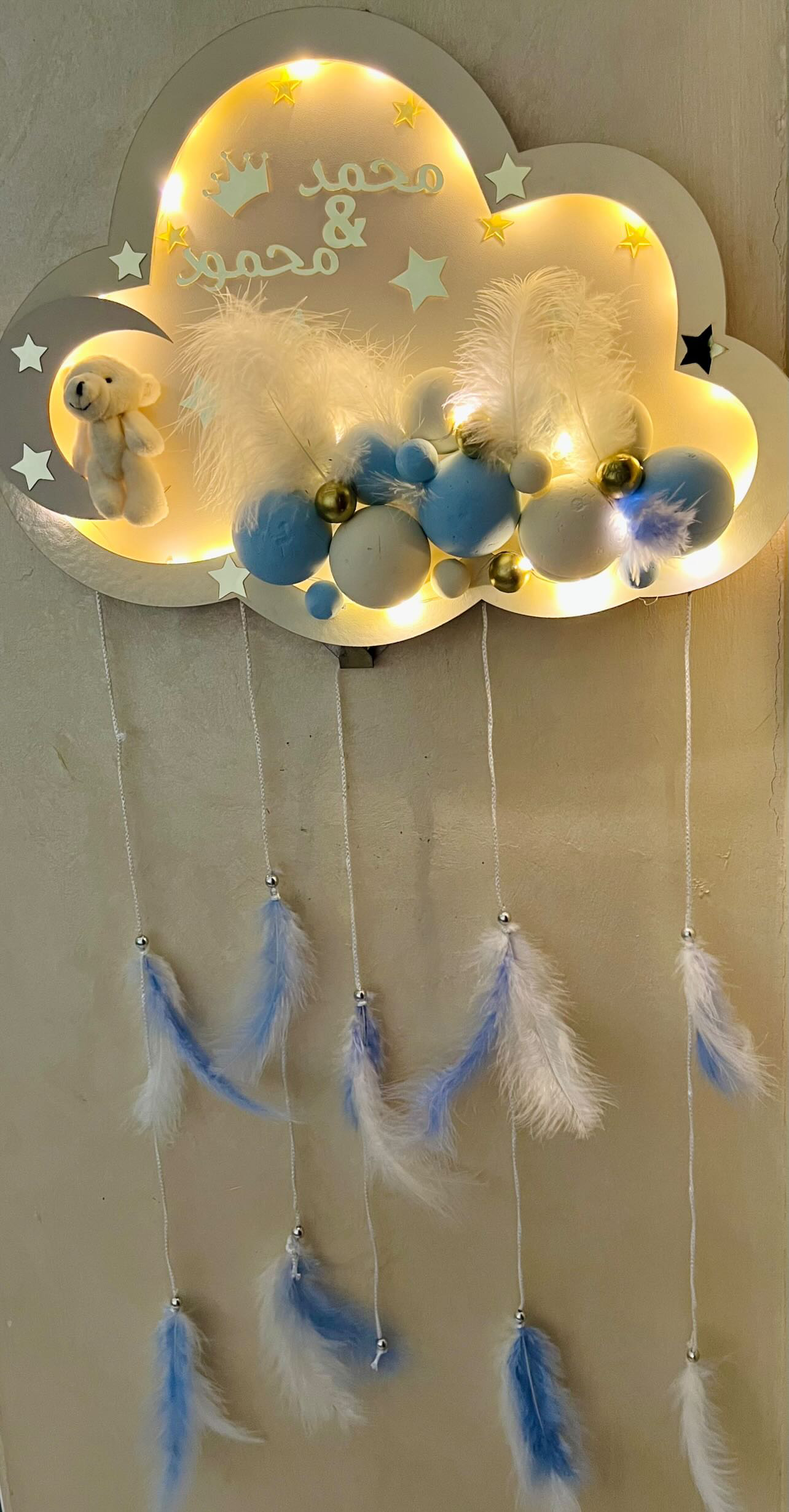 تعليقه لون بيج مع كرات ازرق الاسم ممدوح لون الاسم دهبي مع الاشكال